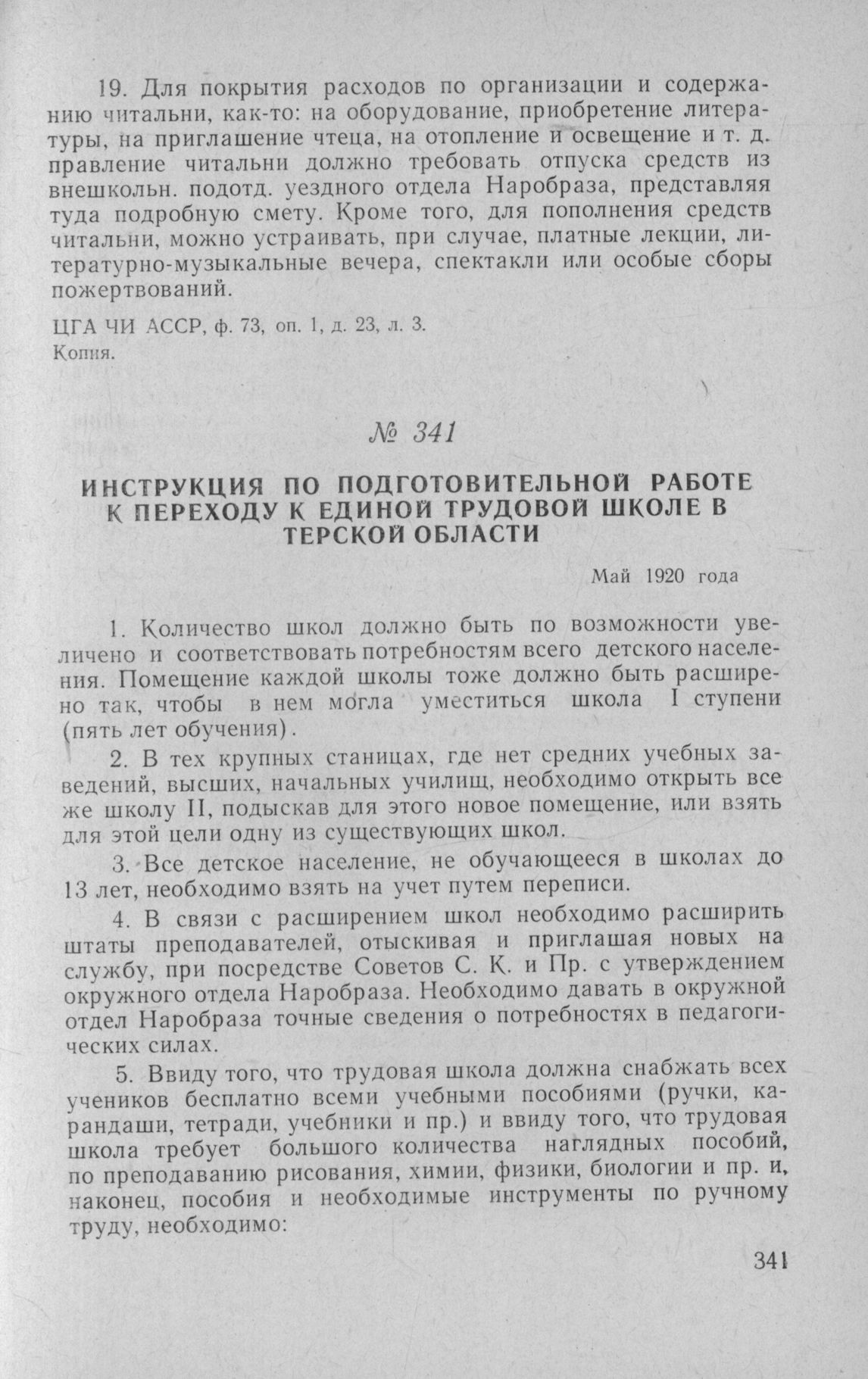 Инструкция по подготовительной работе к переходу к единой трудовой школе в Терской области. Май 1920 года // ЦГА ЧИ АССР, ф. 73, оп. 1, д. 23, л. 2. Копия.