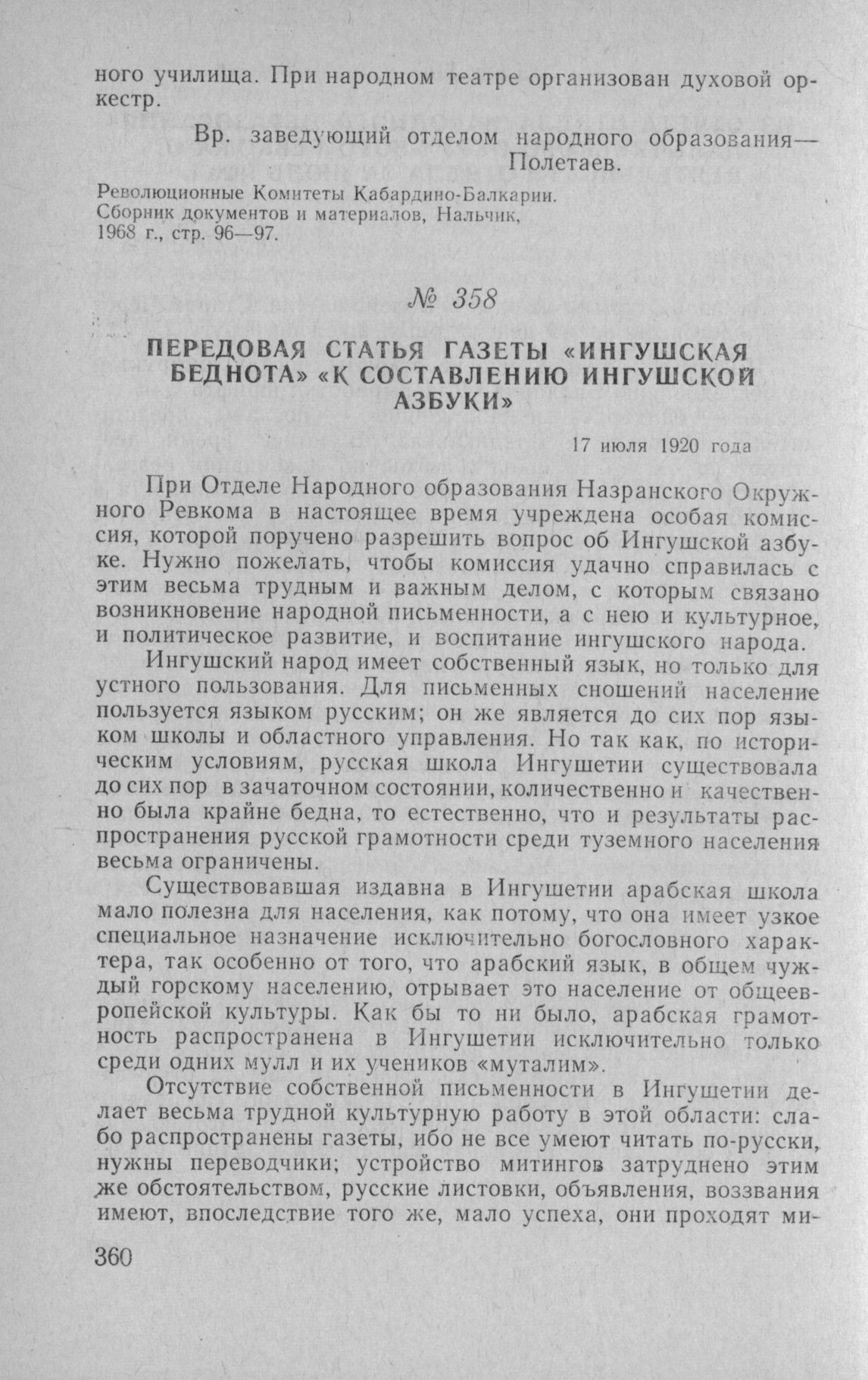 Передовая статья газеты «Ингушская беднота» «К составлению Ингушской азбуки». 17 июля 1920 года // Газета «Ингушская беднота», № 8, 17 июля 1920 г.