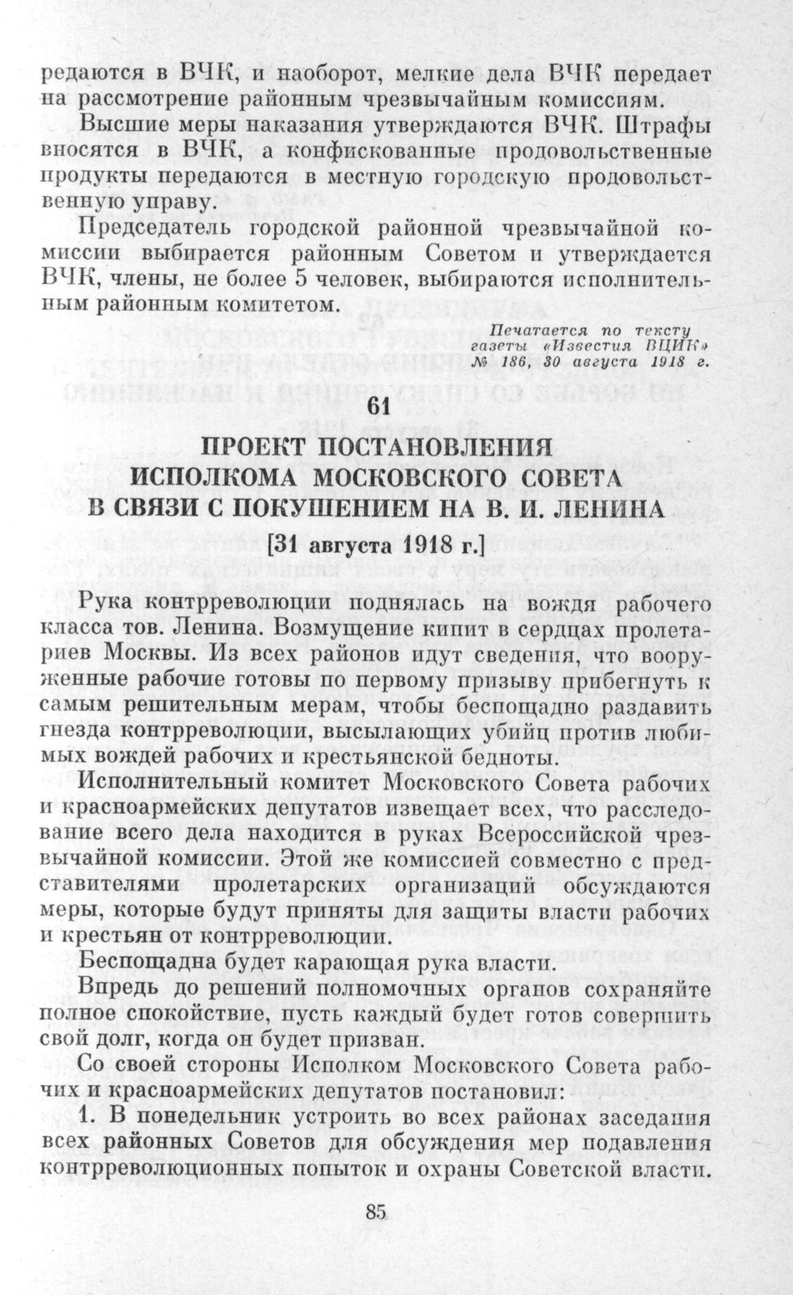 Проект постановления Исполкома Московского Совета в связи с покушением на В. И. Ленина. [31 августа 1918 г.] // ГАМО, ф. 66, оп. 2, в. 27. л. 22. Печатается по рукописи.
