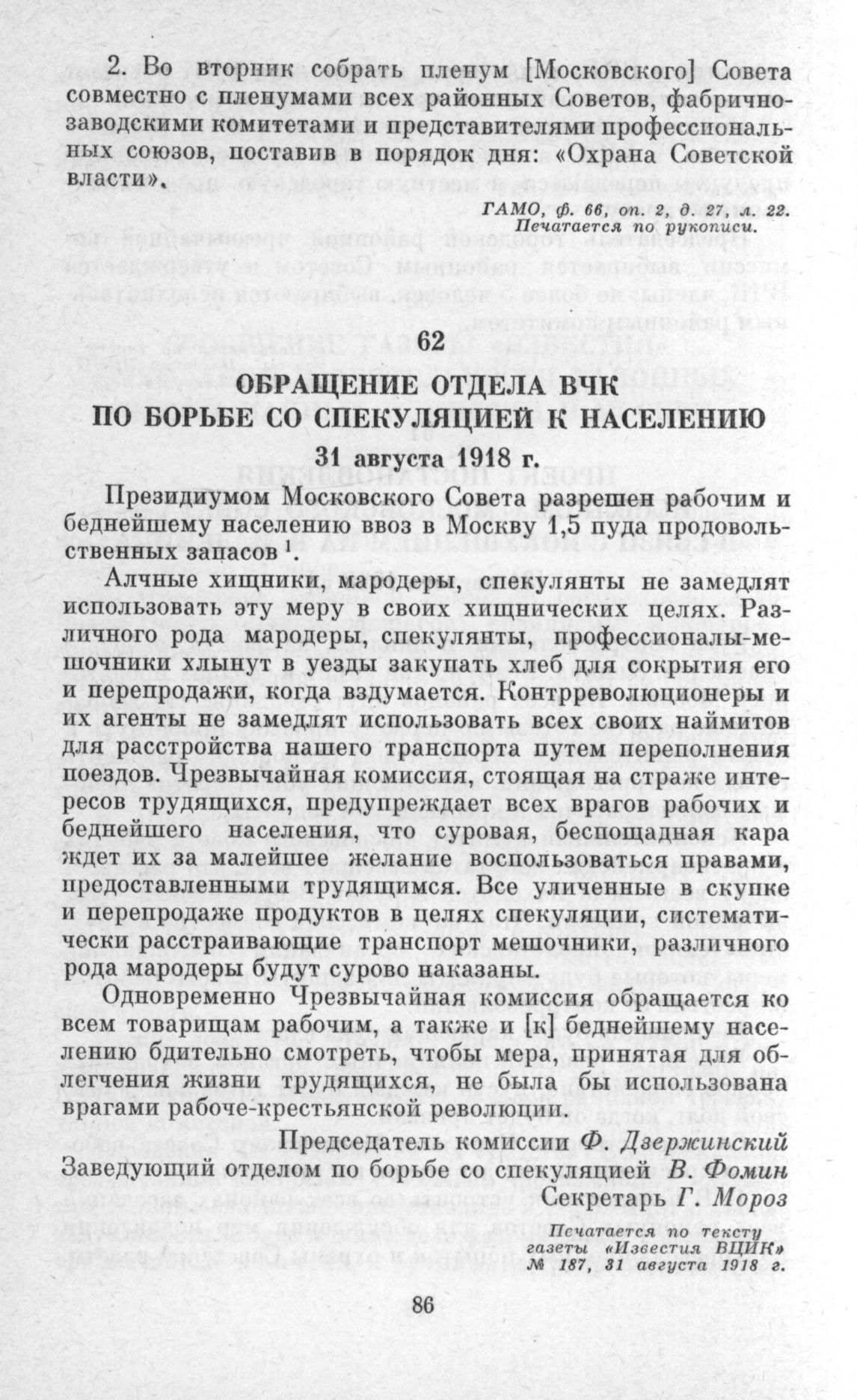 Обращение отдела ВЧК по борьбе со спекуляцией к населению // Печатается по тексту газеты «Известия ВЦИК» № 187, 31 августа 1918 г.