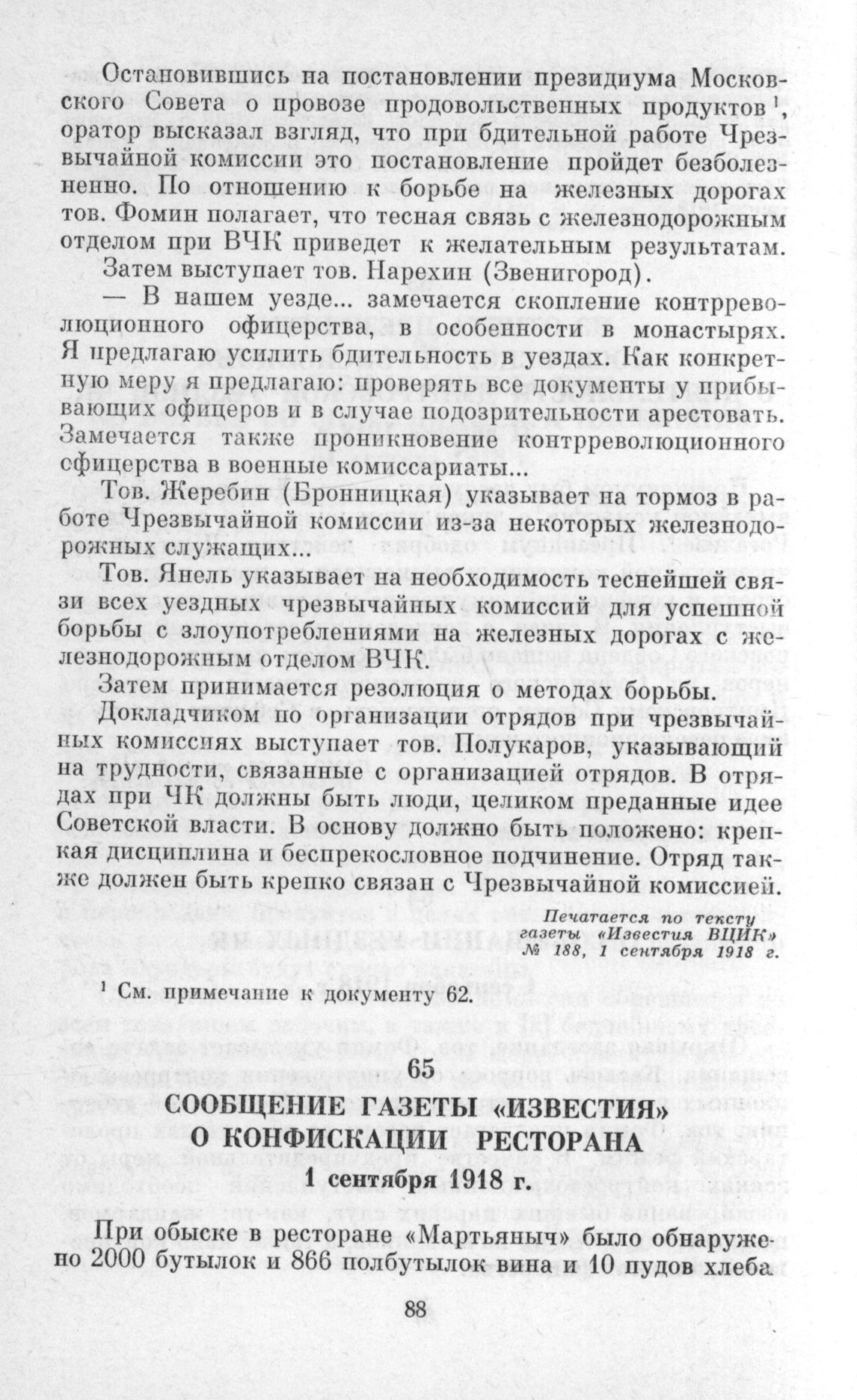 Сообщение газеты «Известия» о конфискации ресторана. 1 сентября 1918 г. // Печатается по тексту газеты «Известия ВЦИК» № 188, 1 сентября 1918 г.