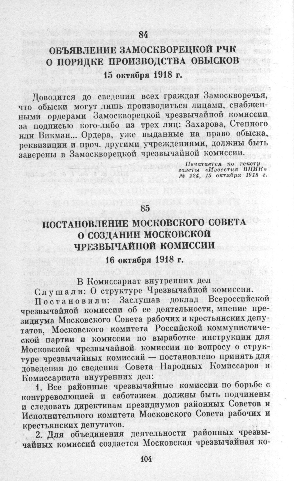 Объявление Замоскворецкой РЧК о порядке производства обысков. 15 октября 1918 г. // Печатается по тексту газеты «Известия ВЦИК» № 224, 15 октября 1918 г.