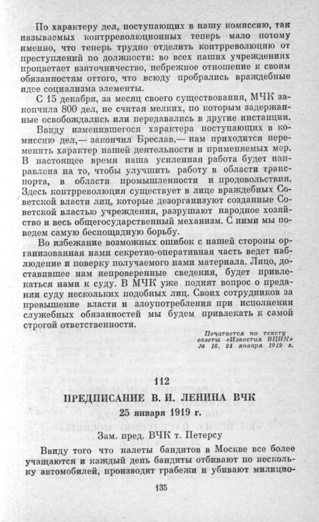 Предписание В. И. Ленина ВЧК. 25 января 1919 г. // Печатается по тексту сборника «В. И. Ленин и ВЧК», М., 1975, с. 142.