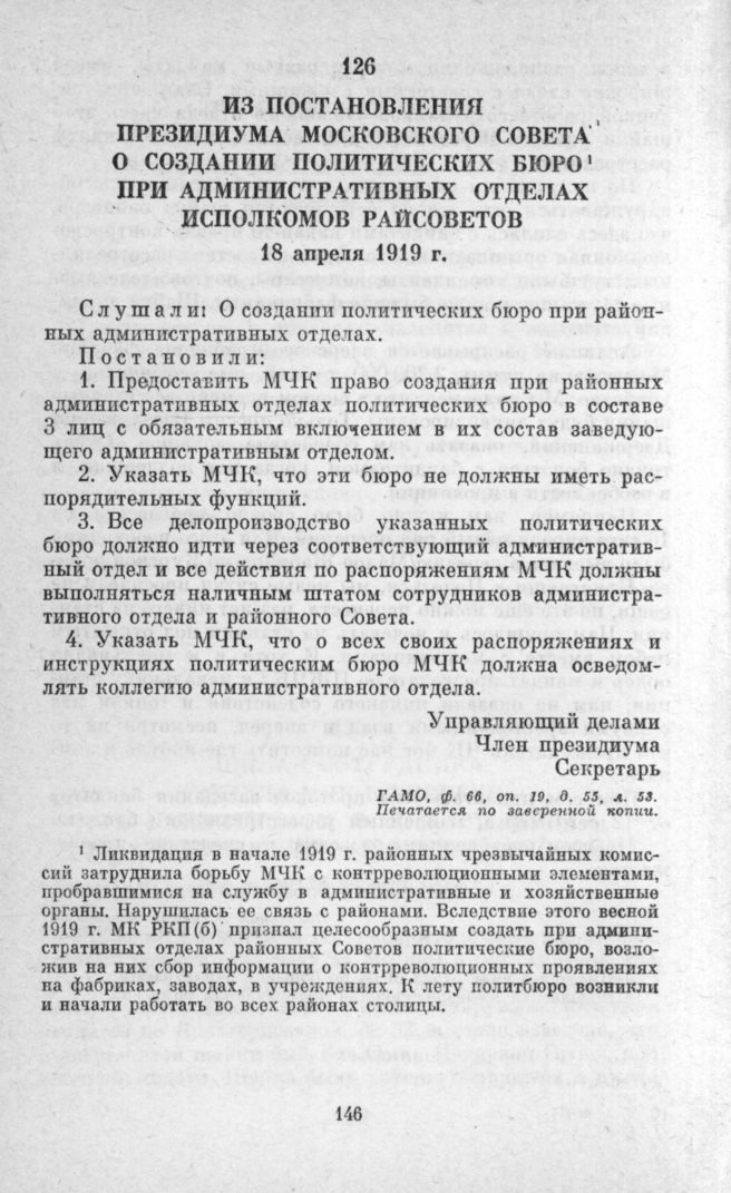 Из постановления президиума Московского Совета о создании политических бюро при административных отделах исполкомов райсоветов. 18 апреля 1919 г. // ГАМО, ф. 66, оп. 19, д. 55, л. 53. Печатается по заверенной копии.