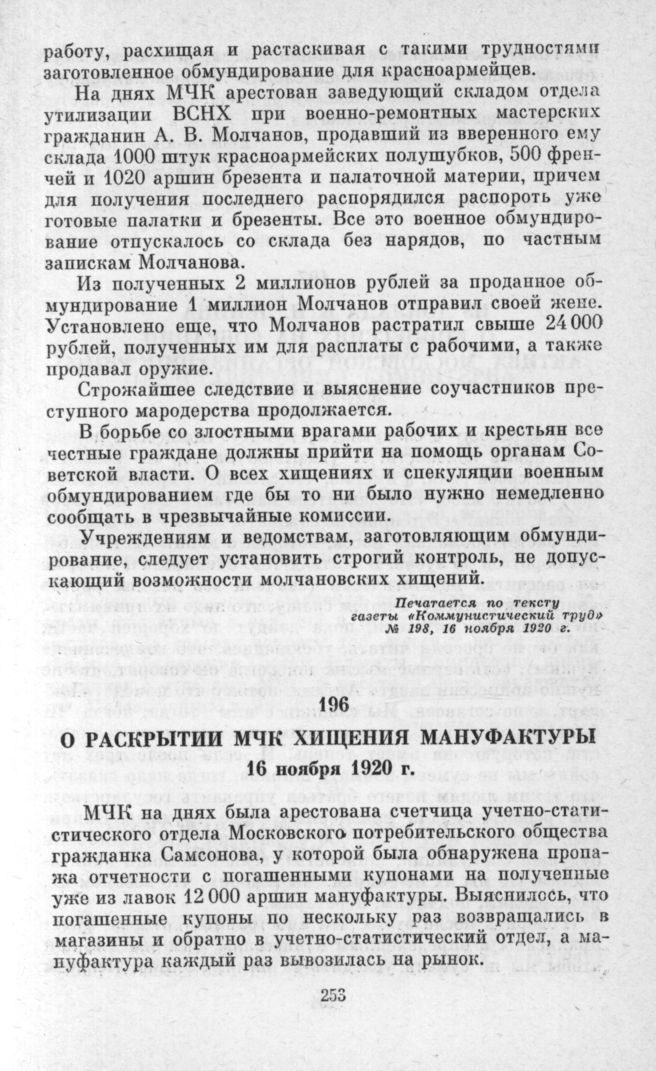 О раскрытии МЧК хищения мануфактуры. 16 ноября 1920 г. // Печатается по тексту газеты «Коммунистический труд» № 198, 16 ноября 1920 г.
