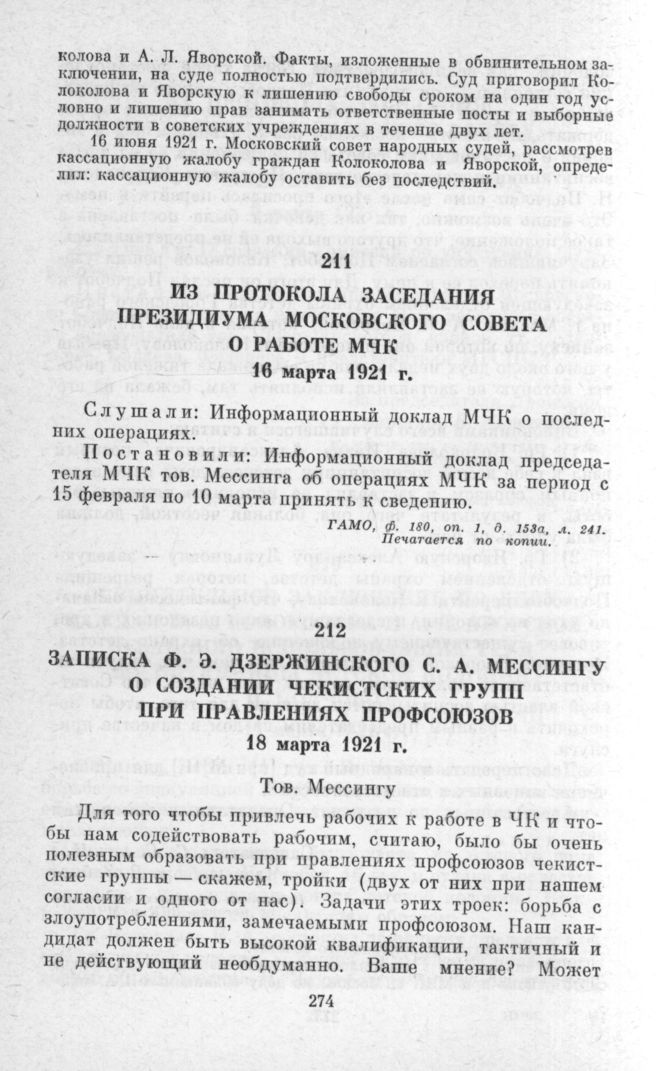 Записка Ф. Э. Дзержинского С. А. Мессингу о создании чекистских групп при правлениях профсоюзов. 18 марта 1921 г. // Печатается по тексту сборника «Из истории ВЧК», с. 436.