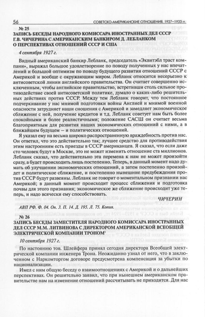 Запись беседы народного комиссара иностранных дел СССР Г.В. Чичерина с американским банкиром Д. Лебланком о перспективах отношений СССР и США. 4 сентября 1927 г. // АВП РФ. Ф. 04. Oп. 3. П. 14. Д. 195. Л. 75. Копия.