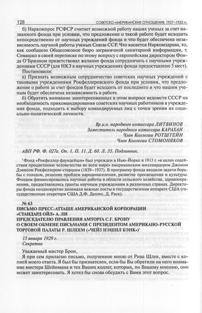 Письмо пресс-атташе американской корпорации «Стандард ойл» А. Ли председателю правления Амторга С.Г. Брону о своем обмене письмами с президентом Американо-русской торговой палаты Р. Шлеем («Чейз нэшнл бэнк»). 15 января 1929 г. // АВП РФ. Ф. 0129. Oп. 9. Л. 115. Д. 190. Л. 146+об. Копия. Перевод с английского.