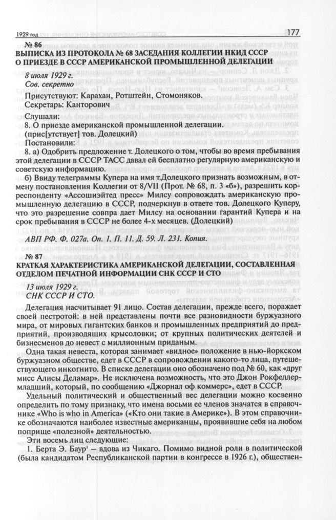 Выписка из протокола № 68 заседания коллегии НКИД СССР о приезде в СССР американской промышленной делегации. 8 июля 1929 г. [2] // АВП РФ. Ф. 027а. Oп. 1. П. 11. Д. 59. Л. 231. Копия.