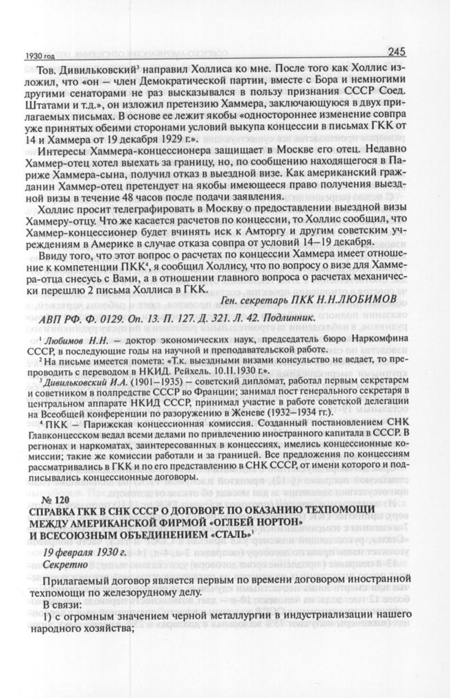 Справка ГКК в СНК СССР о договоре по оказанию техпомощи между американской фирмой «Оглбей Нортон» и Всесоюзным объединением «Сталь». 19 февраля 1930 г. // АВП РФ. Ф. 05. Oп. 10. П. 68. Д. 121. Л. 12 + оборот, 13. Подлинник.