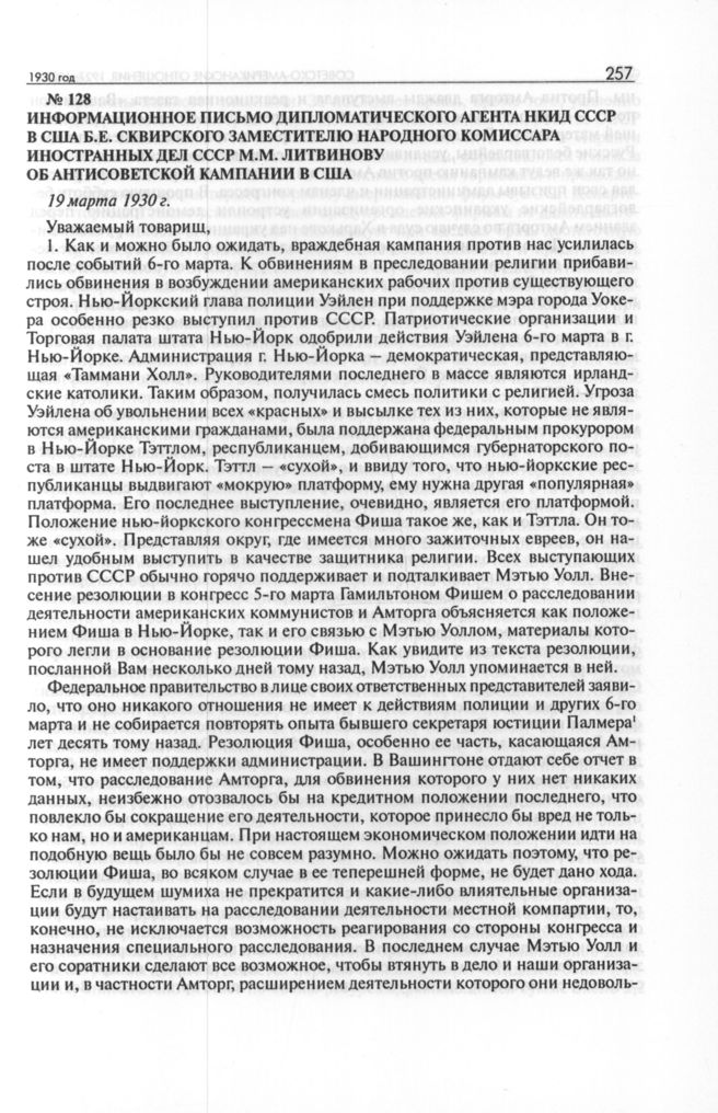 Информационное письмо дипломатического агента НКИД СССР в США Б.Е. Сквирского заместителю народного комиссара иностранных дел СССР М.М. Литвинову об антисоветской кампании в США. 19 марта 1930 г. // АВП РФ. Ф. 0129. Oп. 4. П. 125. Д. 306. Л. 41-47. Копия.