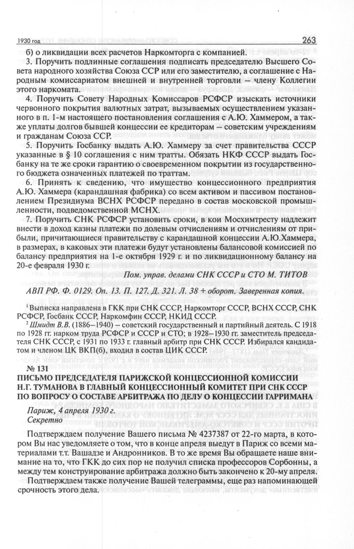Письмо председателя Парижской концессионной комиссии Н.Г. Туманова в Главный концессионный комитет при СНК СССР по вопросу о составе арбитража по делу о концессии Гарримана. 4 апреля 1930 г. // АВП РФ. Ф. 0129. Oп. 13. П. 127. Д. 321. Л. 50. Заверенная копия.
