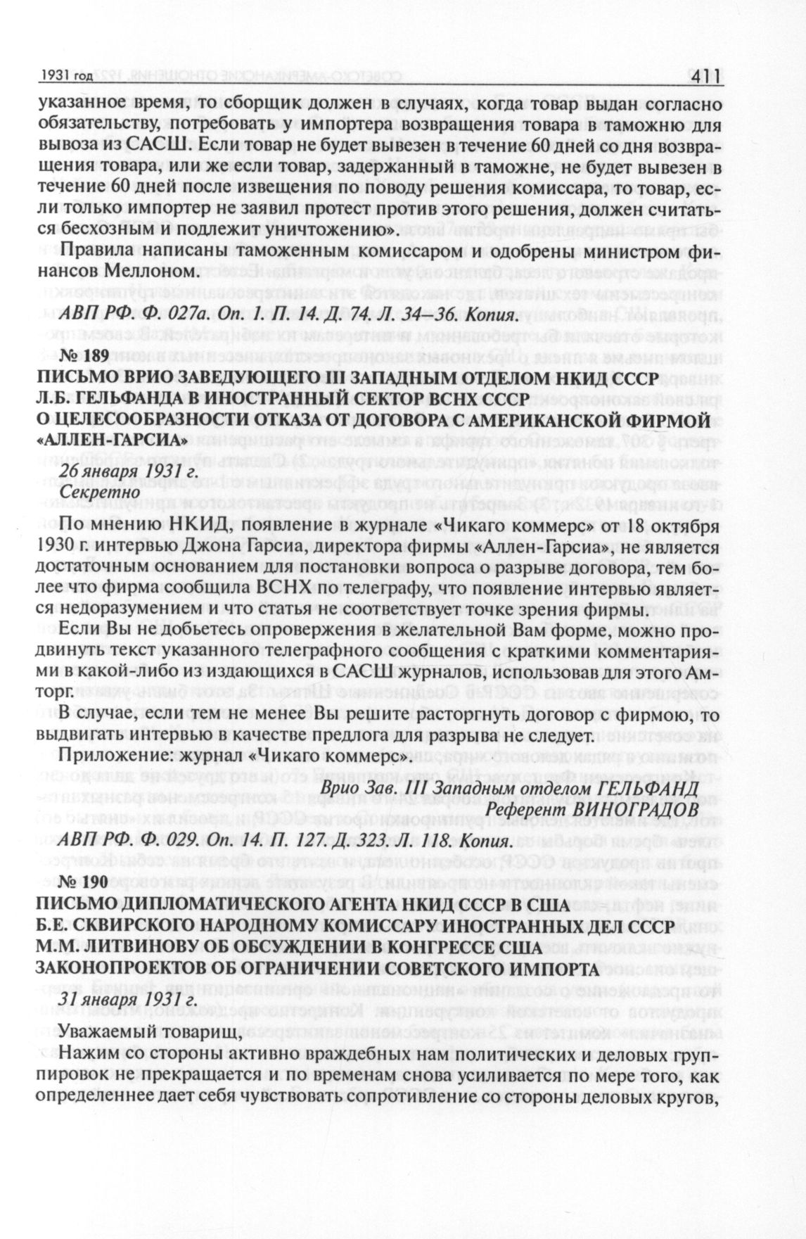Письмо дипломатического агента НКИД СССР в США Б.Е. Сквирского народному комиссару иностранных дел СССР М.М. Литвинову об обсуждении в конгрессе США законопроектов об ограничении советского импорта. 31 января 1931 г. // АВП РФ. Ф. 05. Oп. 11. П. 80. Д. 124. Л. 19-25. Подлинник.