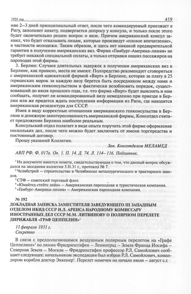 Докладная записка заместителя заведующего III Западным отделом НКИД СССР И.Л. Аренса народному комиссару иностранных дел СССР М.М. Литвинову о полярном перелете дирижабля «Граф Цеппелин». 11 февраля 1931 г. // АВП РФ. Ф. 027а. Oп. 1. П. 14. Д. 74. Л. 158 + оборот. Подлинник.