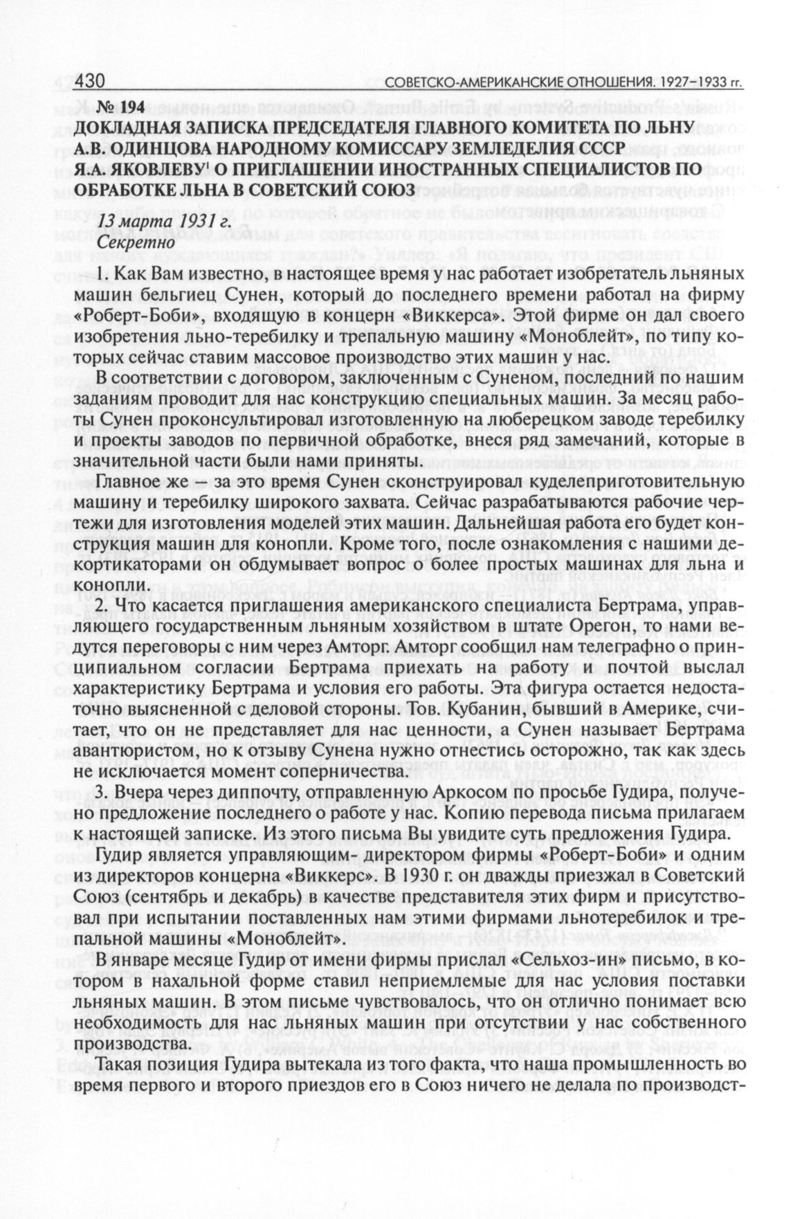 Докладная записка председателя Главного комитета по льну А.В. Одинцова народному комиссару земледелия СССР Я.А. Яковлеву о приглашении иностранных специалистов по обработке льна в Советский Союз. 13 марта 1931 г. // АВП РФ. Ф. 0129. Oп. 14. П. 127. Д. 323. Л. 116 + оборот. Копия.