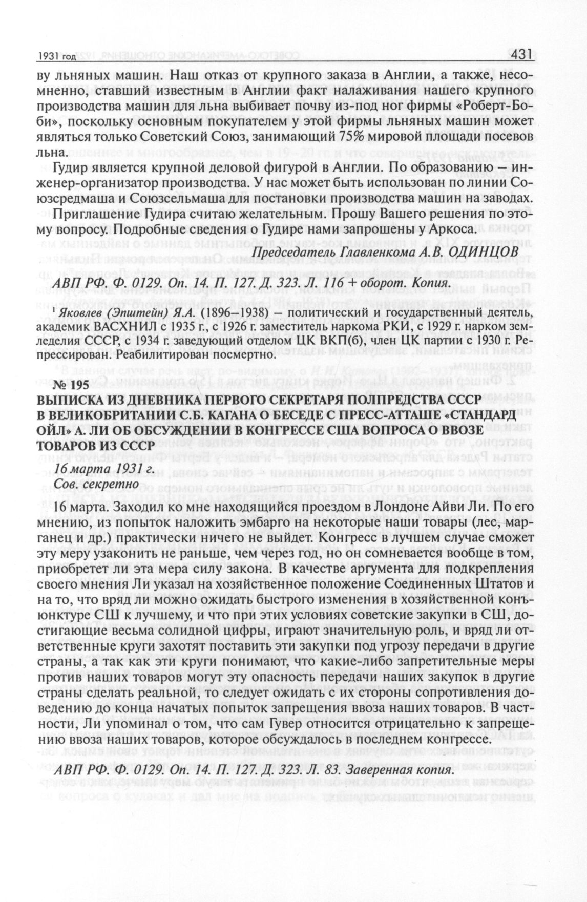 Выписка из дневника первого секретаря полпредства СССР в Великобритании С.Б. Кагана о беседе с пресс-атташе «Стандард ойл» А. Ли об обсуждении в конгрессе США вопроса о ввозе товаров из СССР. 16 марта 1931 г. // АВП РФ. Ф. 0129. Oп. 14. П. 127. Д. 323. Л. 83. Заверенная копия.