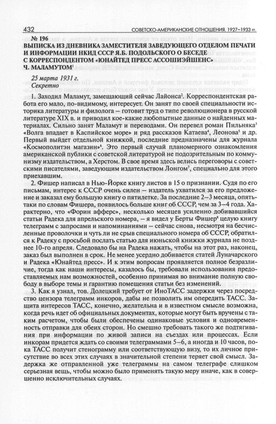 Выписка из дневника заместителя заведующего Отделом печати и информации НКИД СССР Я.Б. Подольского о беседе с корреспондентом «Юнайтед пресс ассошиэйшенс» Ч. Маламутом. 25 марта 1931 г. // АВП РФ. Ф. 0129. Oп. 14. П. 127. Д. 323. Д. 32-33. Копия.