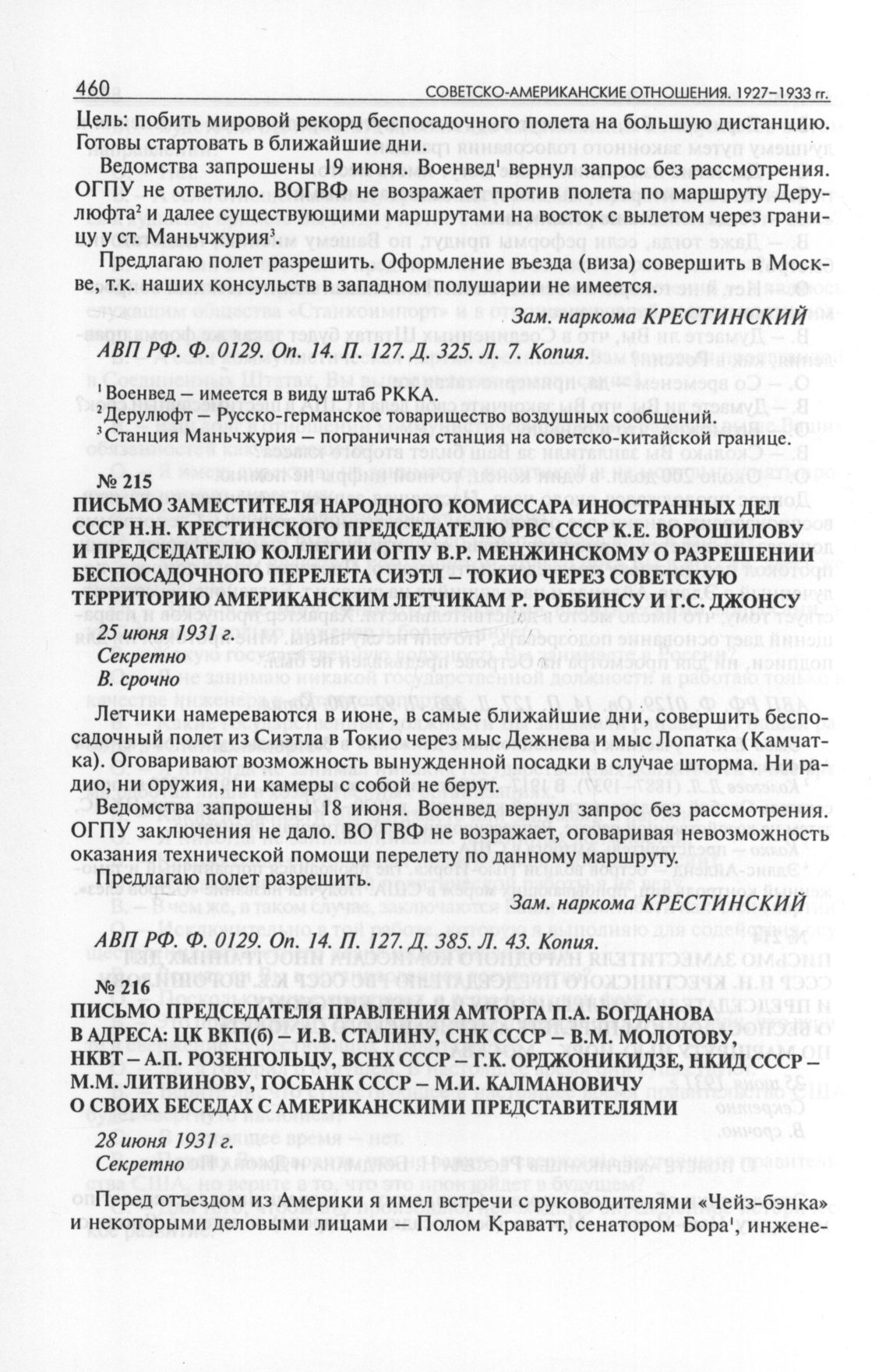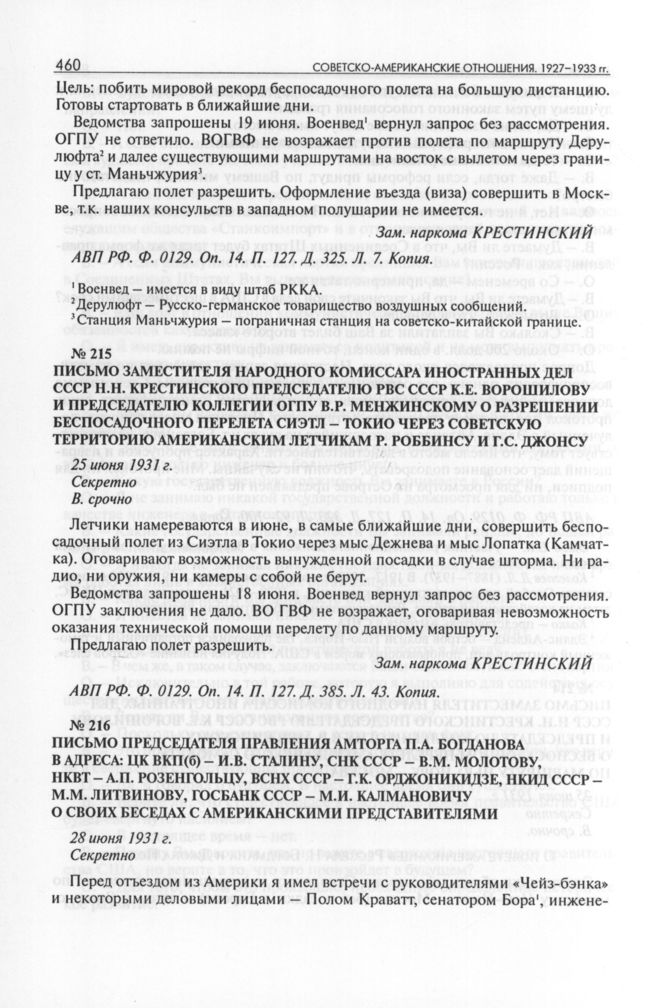 Письмо заместителя народного комиссара иностранных дел СССР Н.Н. Крестинского председателю РВС СССР К.Е. Ворошилову и председателю коллегии ОГПУ В.Р. Менжинскому о разрешении беспосадочного перелета Сиэтл - Токио через советскую территорию американским летчикам Р. Роббинсу и Г.С. Джонсу. 25 июня 1931 г. // АВП РФ. Ф. 0129. Oп. 14. П. 127. Д. 385. Л. 43. Копия.
