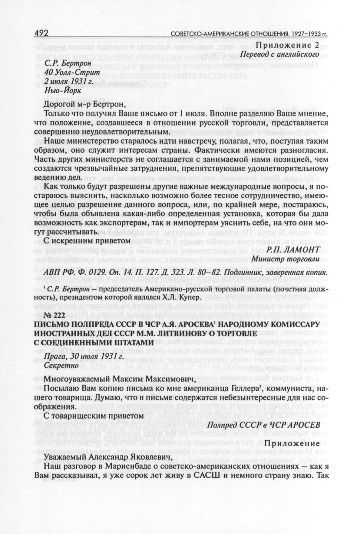 Письмо полпреда СССР в ЧСР А.Я. Аросева народному комиссару иностранных дел СССР М.М. Литвинову о торговле с Соединенными Штатами. 30 июля 1931 г. // АВП РФ. Ф. 0129. Оп. 14. П. 127. Д. 323. Л. 60-62. Подлинник и копия.