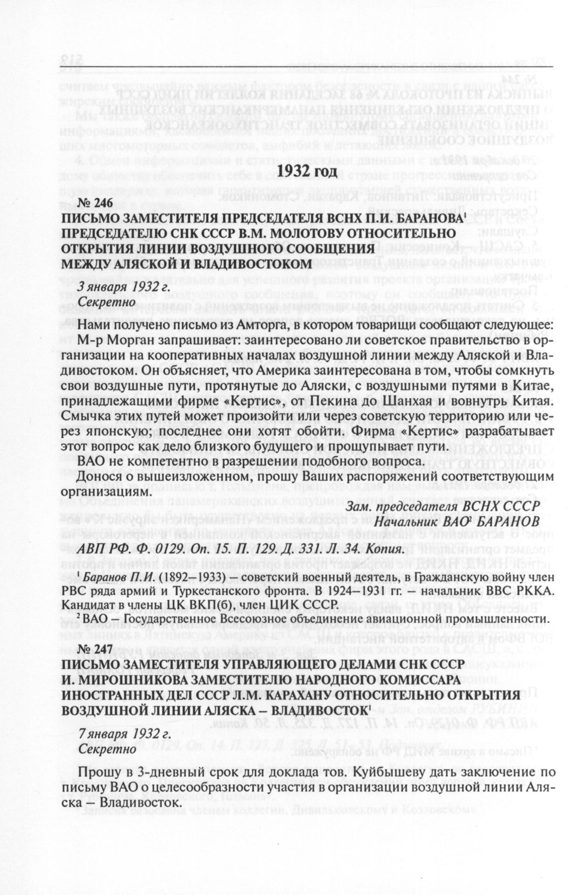 Письмо заместителя управляющего делами СНК СССР И. Мирошникова заместителю народного комиссара иностранных дел СССР Л.М. Карахану относительно открытия воздушной линии Аляска - Владивосток. 7 января 1932 г. // АВП РФ. Ф. 0129. Oп. 15. П. 128. Д. 331. Л. 38. Подлинник.