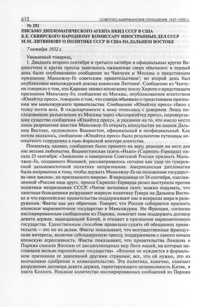 Письмо дипломатического агента НКИД СССР в США Б.Е. Сквирского народному комиссару иностранных дел СССР М.М. Литвинову о политике СССР и США на Дальнем Востоке. 7 октября 1932 г. // АВП РФ. Ф. 0129. Oп. 15. П. 128. Д. 327. Л. 142-154. Подлинник.