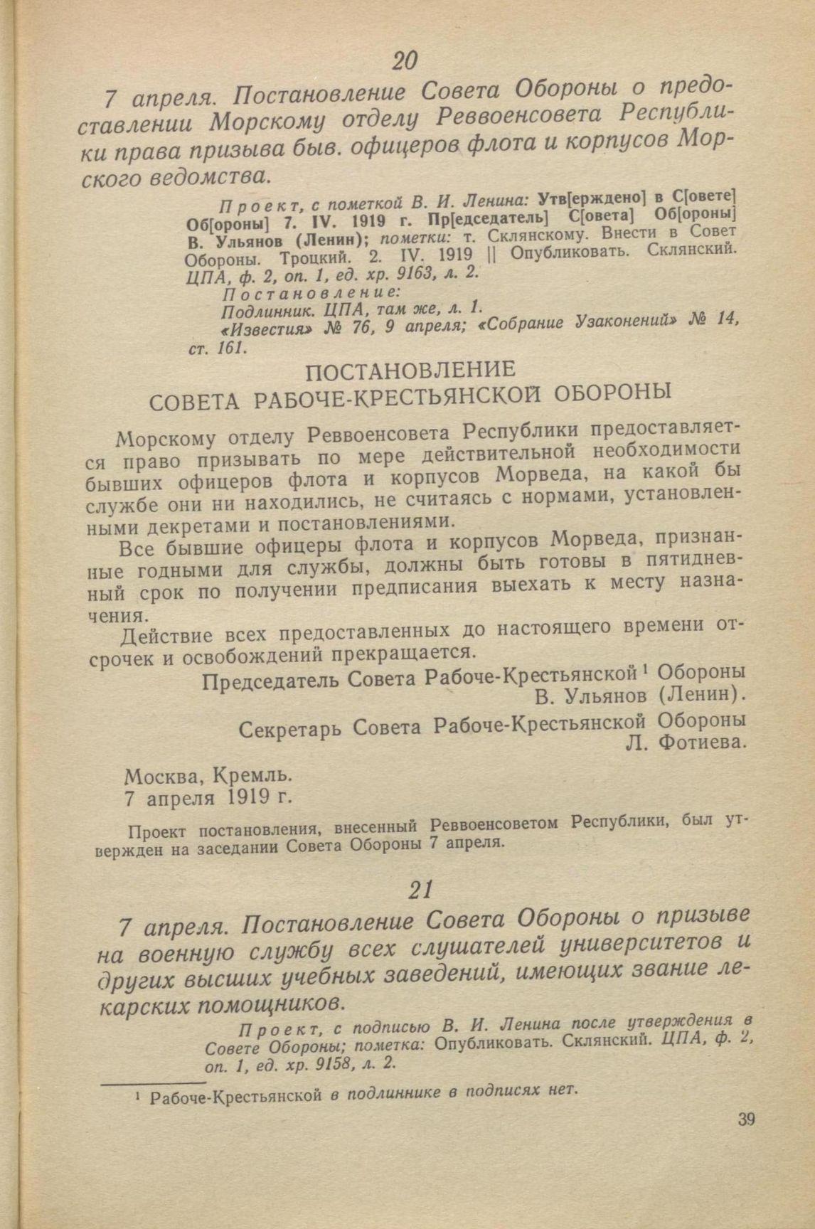 7 апреля. Постановление Совета Обороны о предоставлении Морскому отделу Реввоенсовета Республики права призыва быв. офицеров флота и корпусов Морского ведомства // Проект, с пометкой В. И. Ленина: Утв[ерждено] в С[овете] Об[ороны] 7. IV. 1919 г. Пр[едседатель] С[овета] Об[ороны] В. Ульянов (Ленин); пометки: т. Склянскому. Внести в Совет Обороны. Троцкий. 2. IV. 1919 || Опубликовать. Склянский. ЦПА, ф. 2, оп. 1, ед. хр. 9163, л. 2. Постановление: Подлинник. ЦПА, там же, л. 1. «Известия» № 76, 9 апреля; «Собрание Узаконений» № 14, ст. 161.