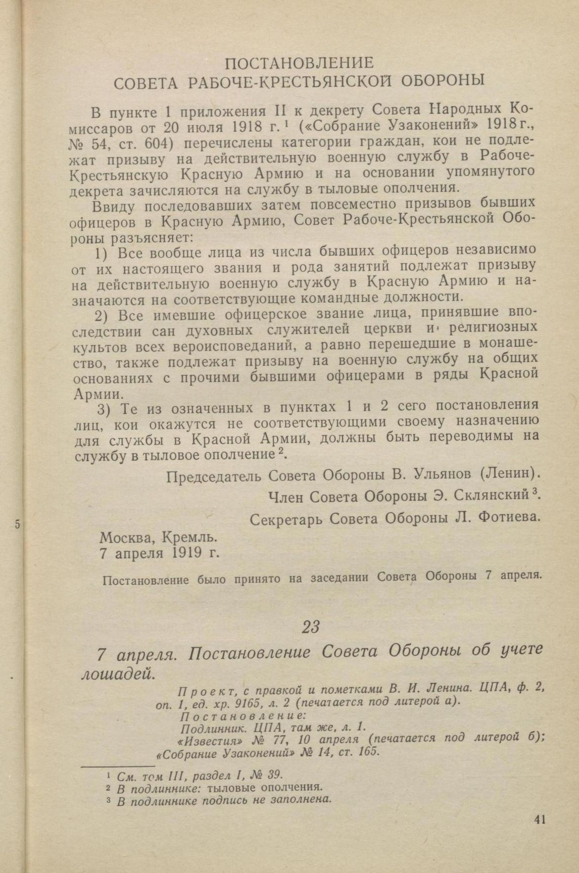7 апреля. Постановление Совета Обороны об учете лошадей // Проект, с правкой и пометками В. И. Ленина. ЦПА, ф. 2, оп. 1, ед. хр. 9165, л. 2 (печатается под литерой а). Постановление: Подлинник. ЦПА, там же, л. 1. «Известия» № 77, 10 апреля (печатается под литерой б); «Собрание Узаконений» № 14, ст. 165.