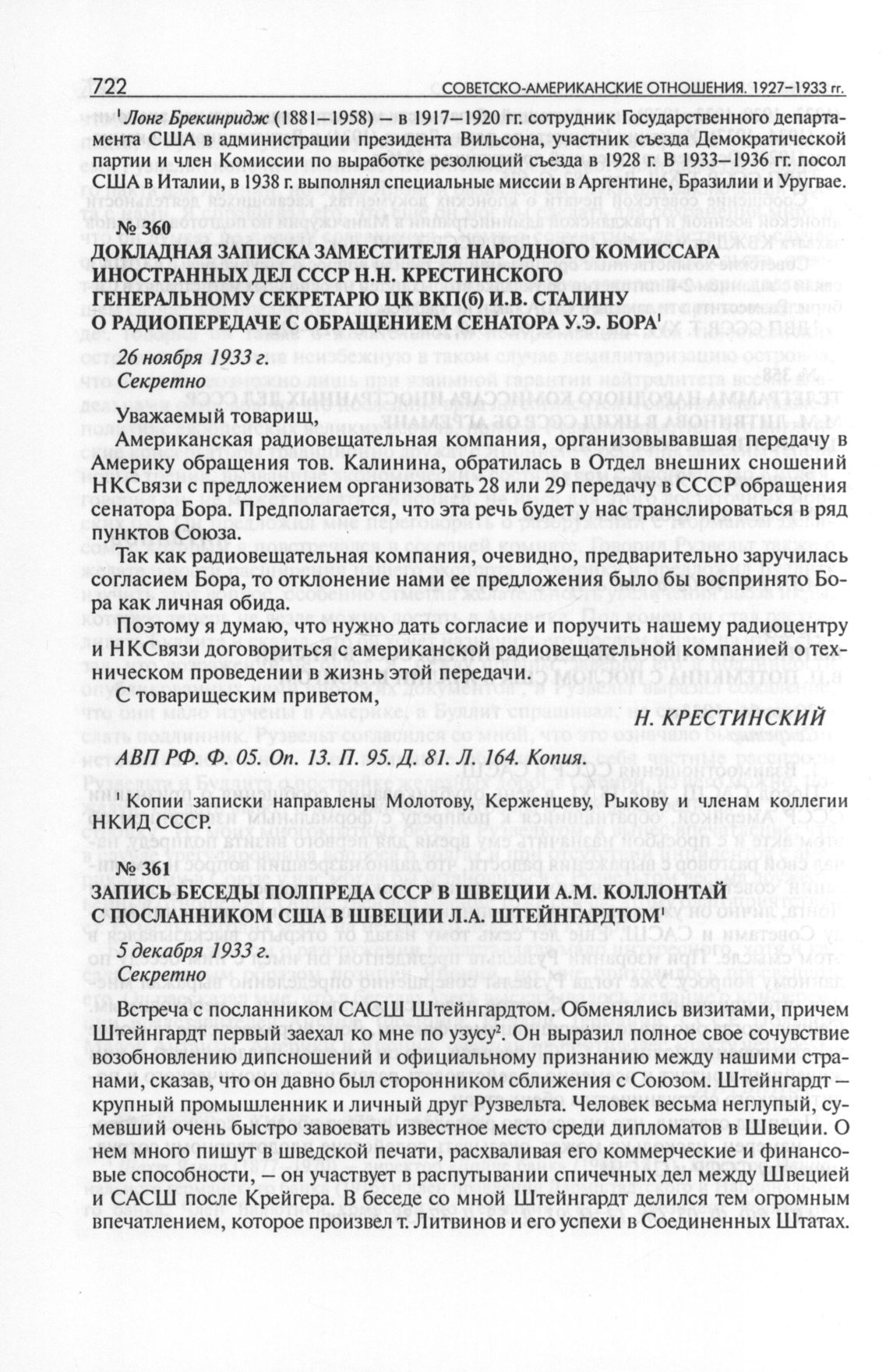 Запись беседы полпреда СССР в Швеции А.М. Коллонтай с посланником США в Швеции Л.А. Штейнгардтом. 5 декабря 1933 г. // АВП РФ. Ф. 05. Oп. 13. П. 93. Д. 55. Л. 46-47. Копия.