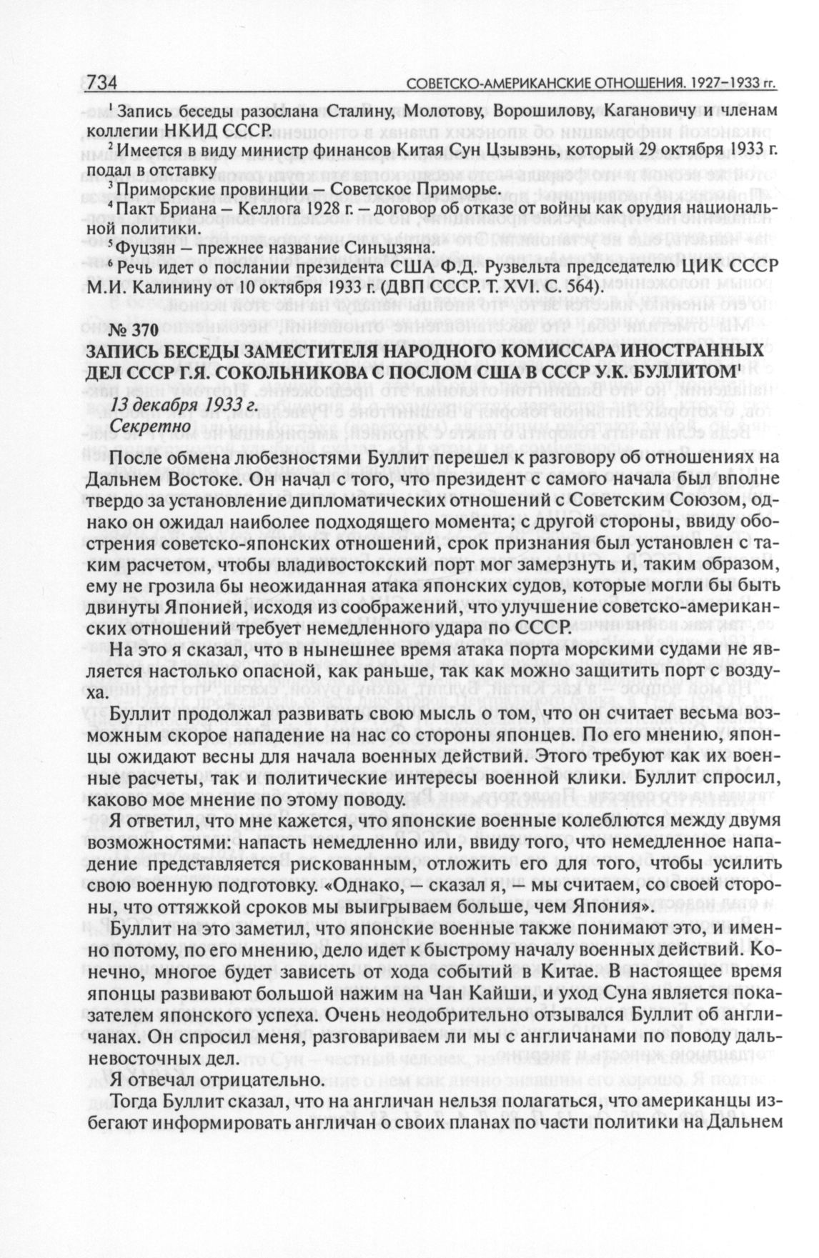 Запись беседы заместителя народного комиссара иностранных дел СССР Г.Я. Сокольникова с послом США в СССР У.К. Буллитом. 13 декабря 1933 г. // АПВ РФ. Ф.05. Oп. 13. П. 89. Д. 4. Л. 56-57. Копия.
