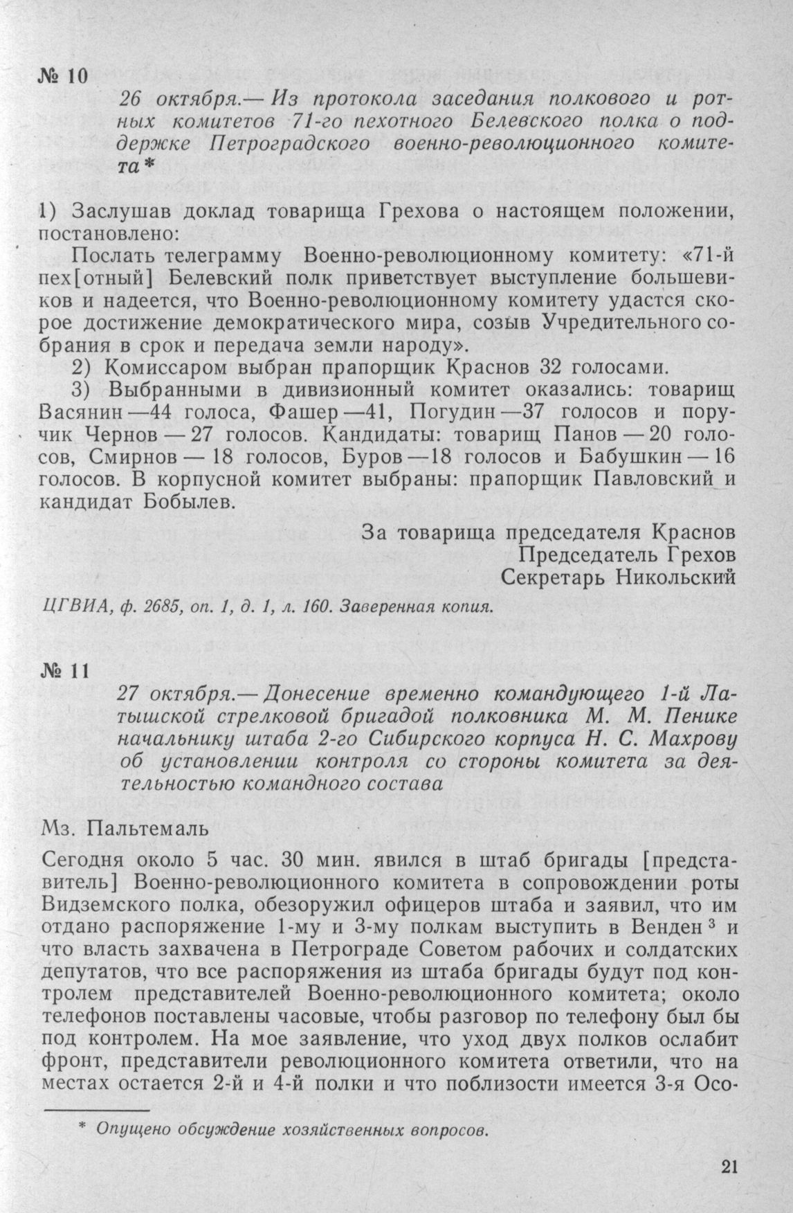 Донесение временно командующего 1-й Латышской стрелковой бригадой полковника М. М. Пенике начальнику штаба 2-го Сибирского корпуса Н. С. Махрову об установлении контроля со стороны комитета за деятельностью командного состава. 27 октября 1917 г. // ЦГВИА, Ф. 2279, Оп. 1, Д. 684, Л. 78. Копия.