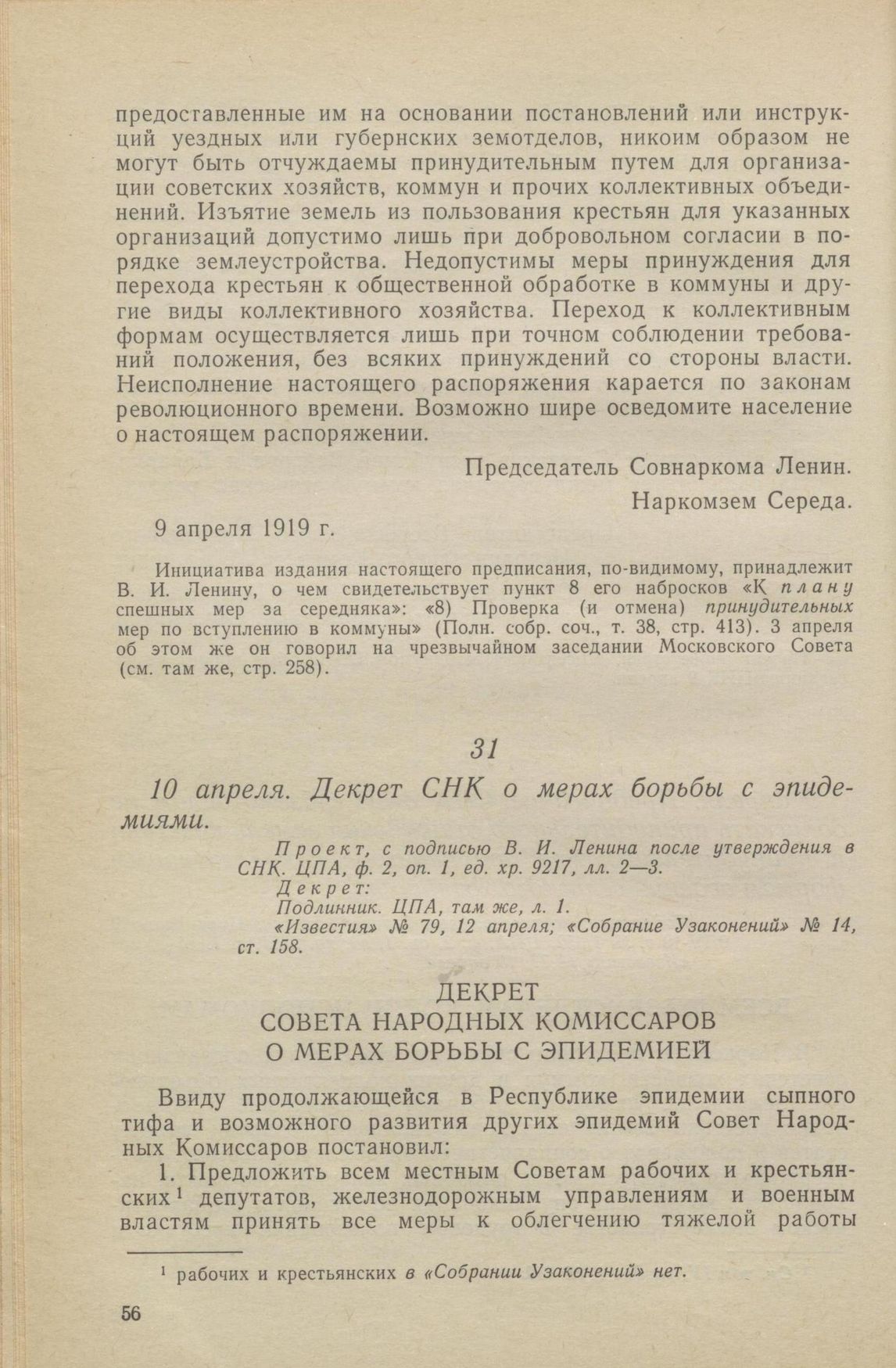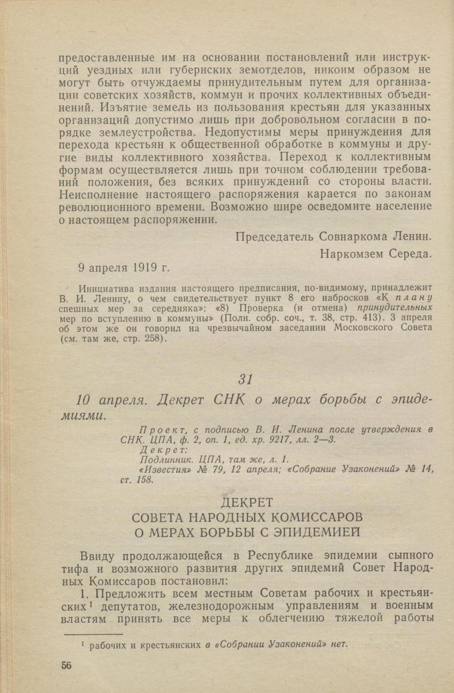 10 апреля. Декрет СНК о мерах борьбы с эпидемиями // Проект, с подписью В. И. Ленина после утверждения в СНК. ЦПА, ф. 2, оп. 1, ед. хр. 9217, лл. 2—3. Декрет: Подлинник. ЦПА, там же, л. 1. «Известия» № 79, 12 апреля; «Собрание Узаконений» № 14, ст. 158.
