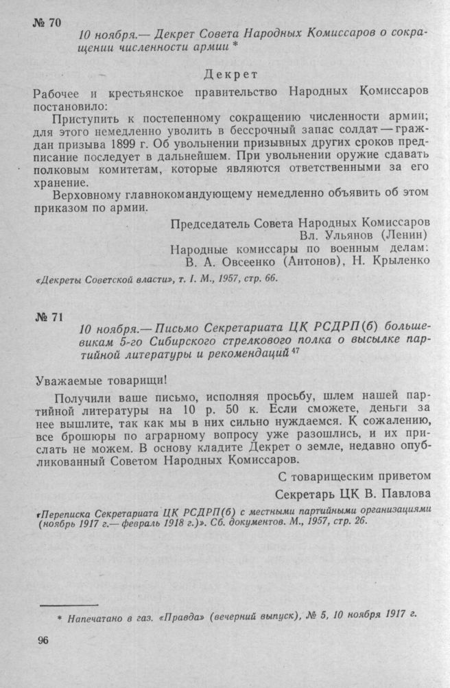 Декрет Совета Народных Комиссаров о сокращении численности армии. 10 ноября 1917 г. // «Декреты Советской власти», Т. I. М., 1957, стр. 66.