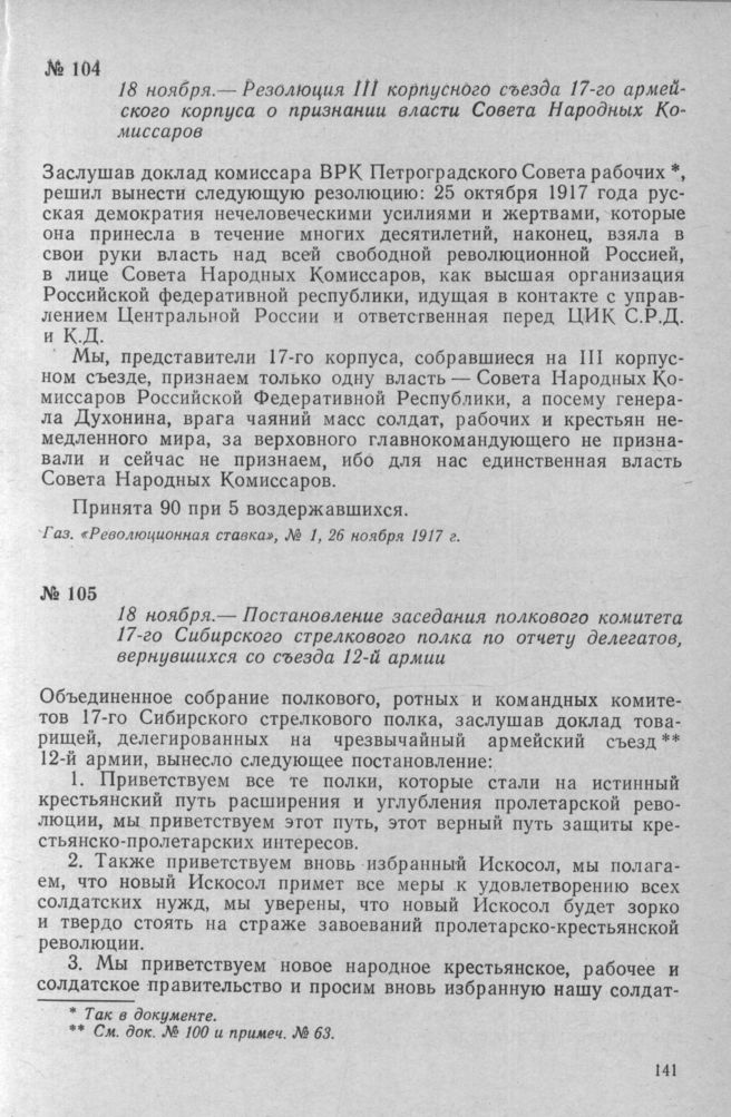 Резолюция III корпусного съезда 17-го армейского корпуса о признании власти Совета Народных Комиссаров. 18 ноября 1917 г. // Газ. «Революционная ставка», № 1, 26 ноября 1917 г.