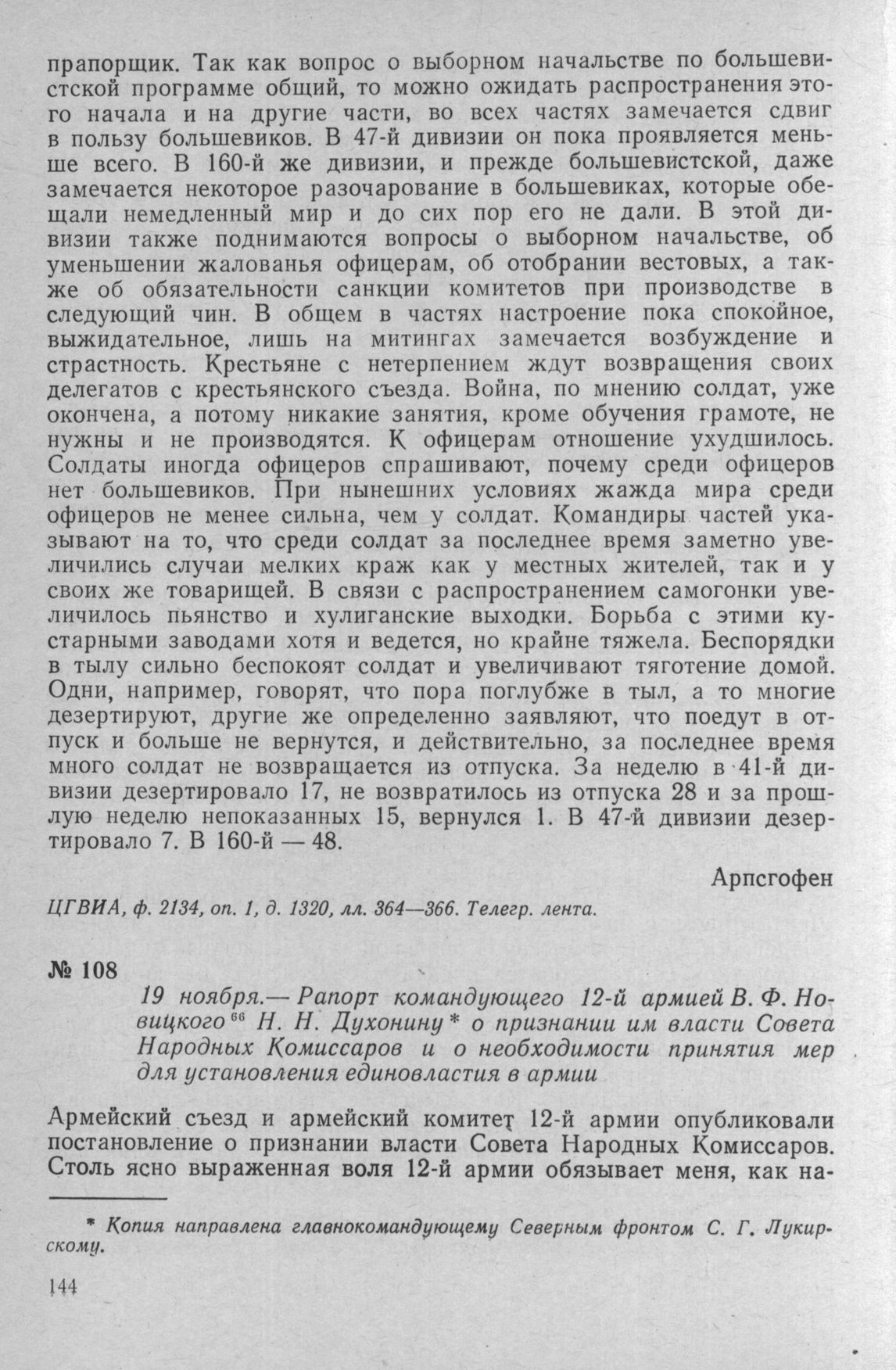 Рапорт командующего 12-й армией В. Ф. Новицкого Н. Н. Духонину о признании им власти Совета Народных Комиссаров и о необходимости принятия мер для установления единовластия в армии. 19 ноября 1917 г. // ЦГВИА, Ф. 2003, Оп. 4, Д. 38, Лл. 30—33. Телегр. лента.