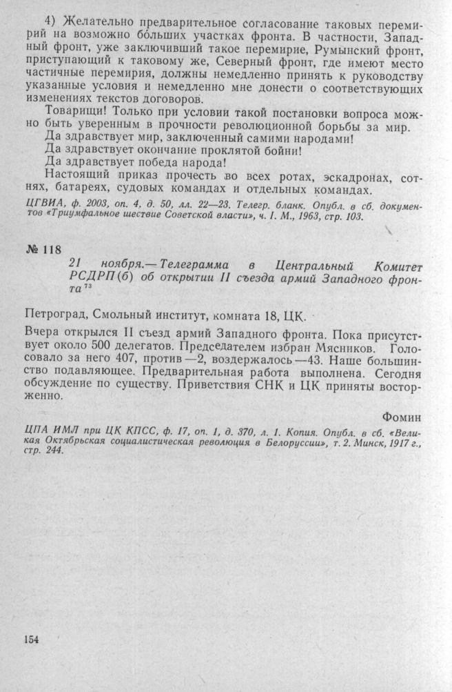Телеграмма в Центральный Комитет РСДРП(б) об открытии II съезда армий Западного фронта. 21 ноября 1917 г. // ЦПА ИМЛ при ЦК КПСС, Ф. 17, Оп. 1, Д. 370, Л. 1. Копия. Опубл. в сб. «Великая Октябрьская социалистическая революция в Белоруссии», Т. 2. Минск, 1917 г., стр. 244.