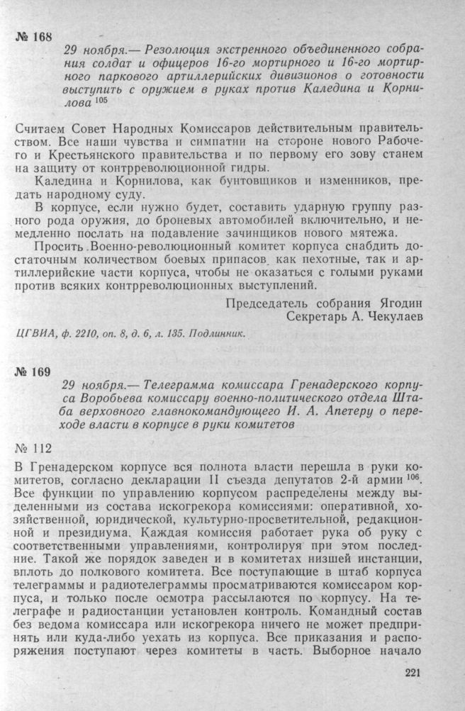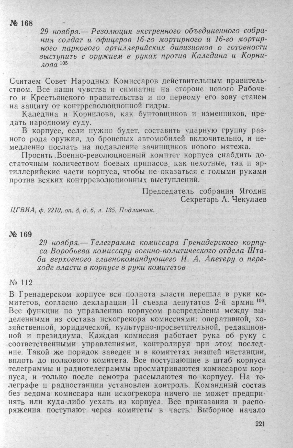 Телеграмма комиссара Гренадерского корпуса Воробьева комиссару военно-политического отдела Штаба верховного главнокомандующего И. А. Апетеру о переходе власти в корпусе в руки комитетов. 29 ноября 1917 г. // ЦГВИА, Ф. 2003, Оп. 4, Д. 51, Лл. 1—3. Телегр. лента.