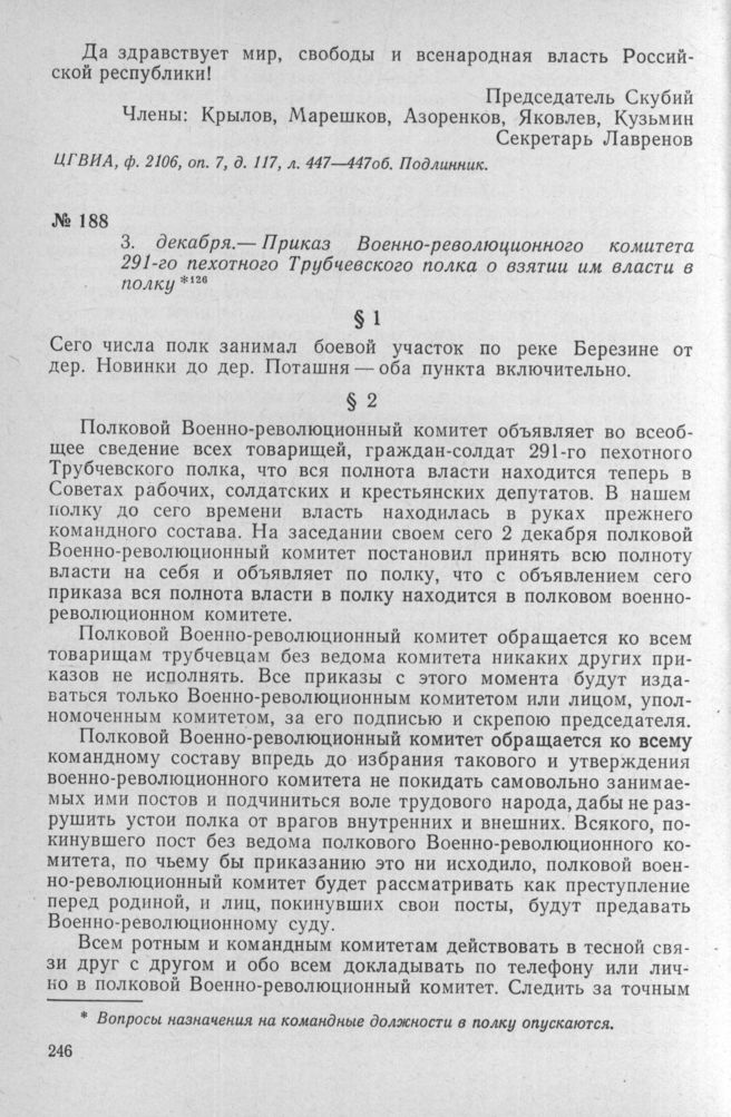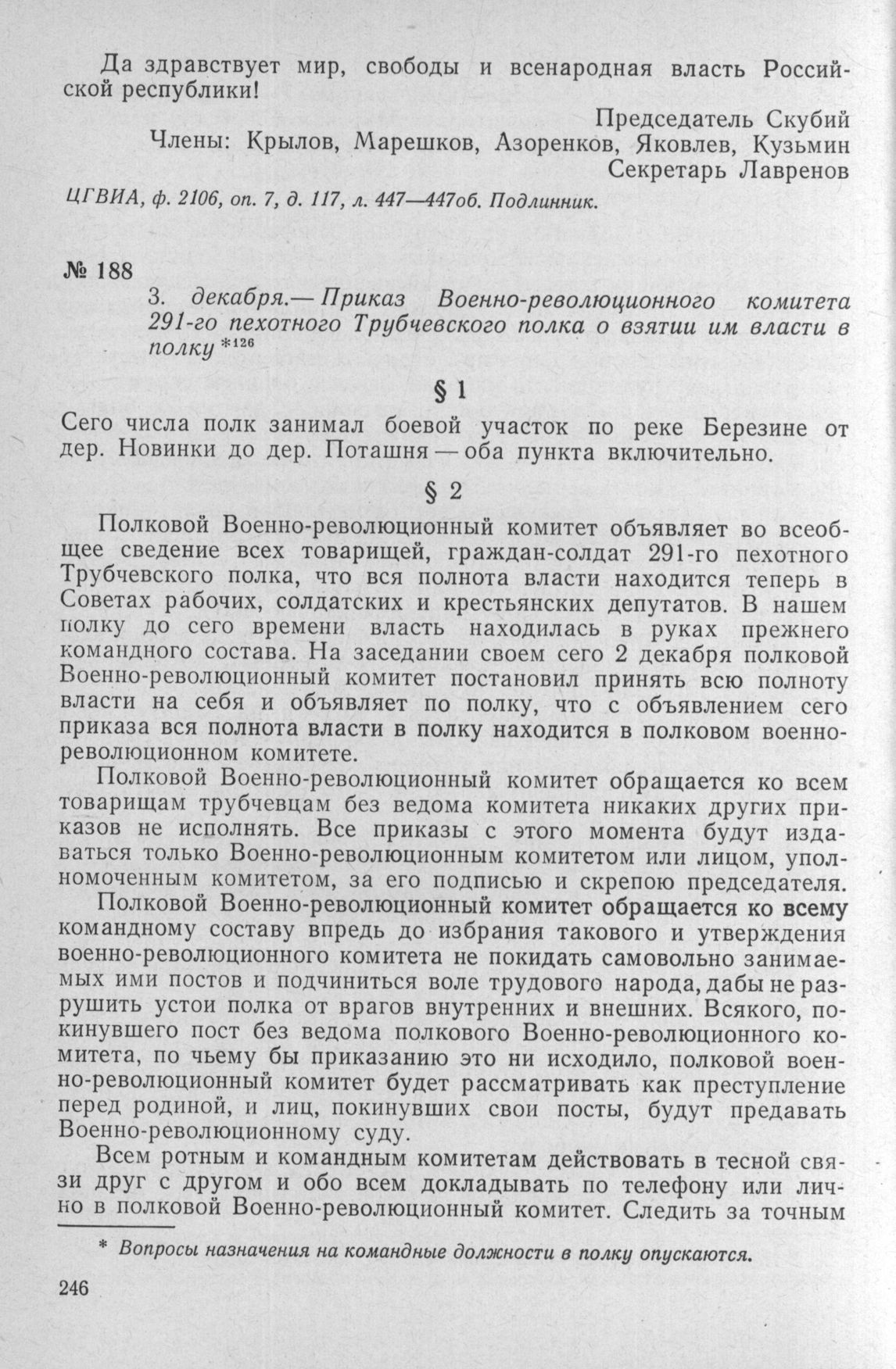 Приказ Военно-революционного комитета 291-го пехотного Трубчевского полка о взятии им власти в полку. 3 декабря 1917 г. // ЦГВИА, Ф. 2900, Оп. 1, Д. 1, Л. 5—5об. СтеклограФ.