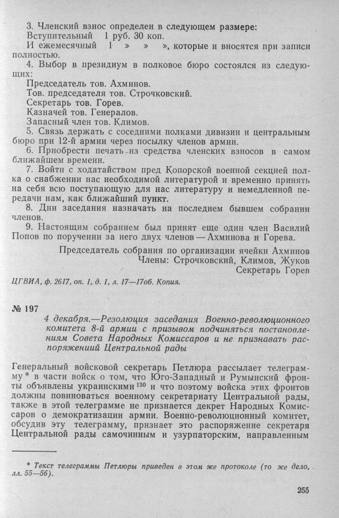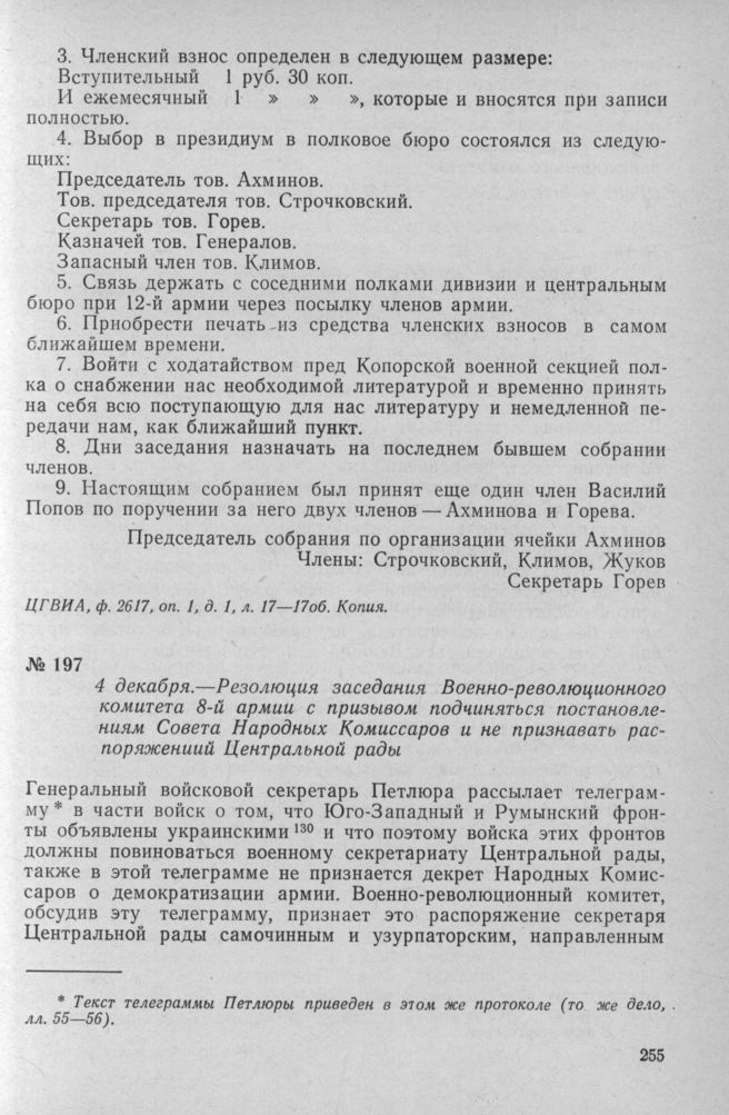 Резолюция заседания Военно-революционного комитета 8-й армии с призывом подчиняться постановлениям Совета Народных Комиссаров и не признавать распоряжениий Центральной рады. 4 декабря 1917 г. // ЦГВИА, Ф. 2134, Оп. 6, Д. 127, Л. 57—57об. Черновик.