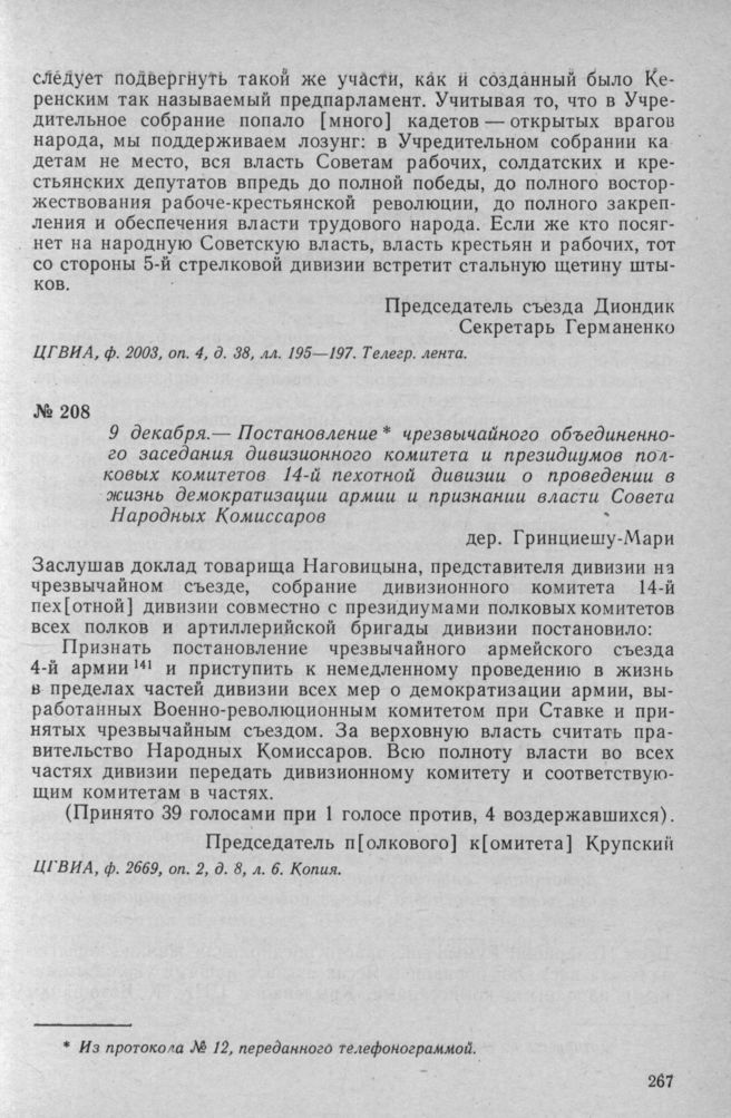 Постановление чрезвычайного объединенного заседания дивизионного комитета и президиумов полковых комитетов 14-й пехотной дивизии о проведении в жизнь демократизации армии и признании власти Совета Народных Комиссаров. 9 декабря 1917 г. // ЦГВИА, Ф. 2669, Оп. 2, Д. 8, Л. 6. Копия.