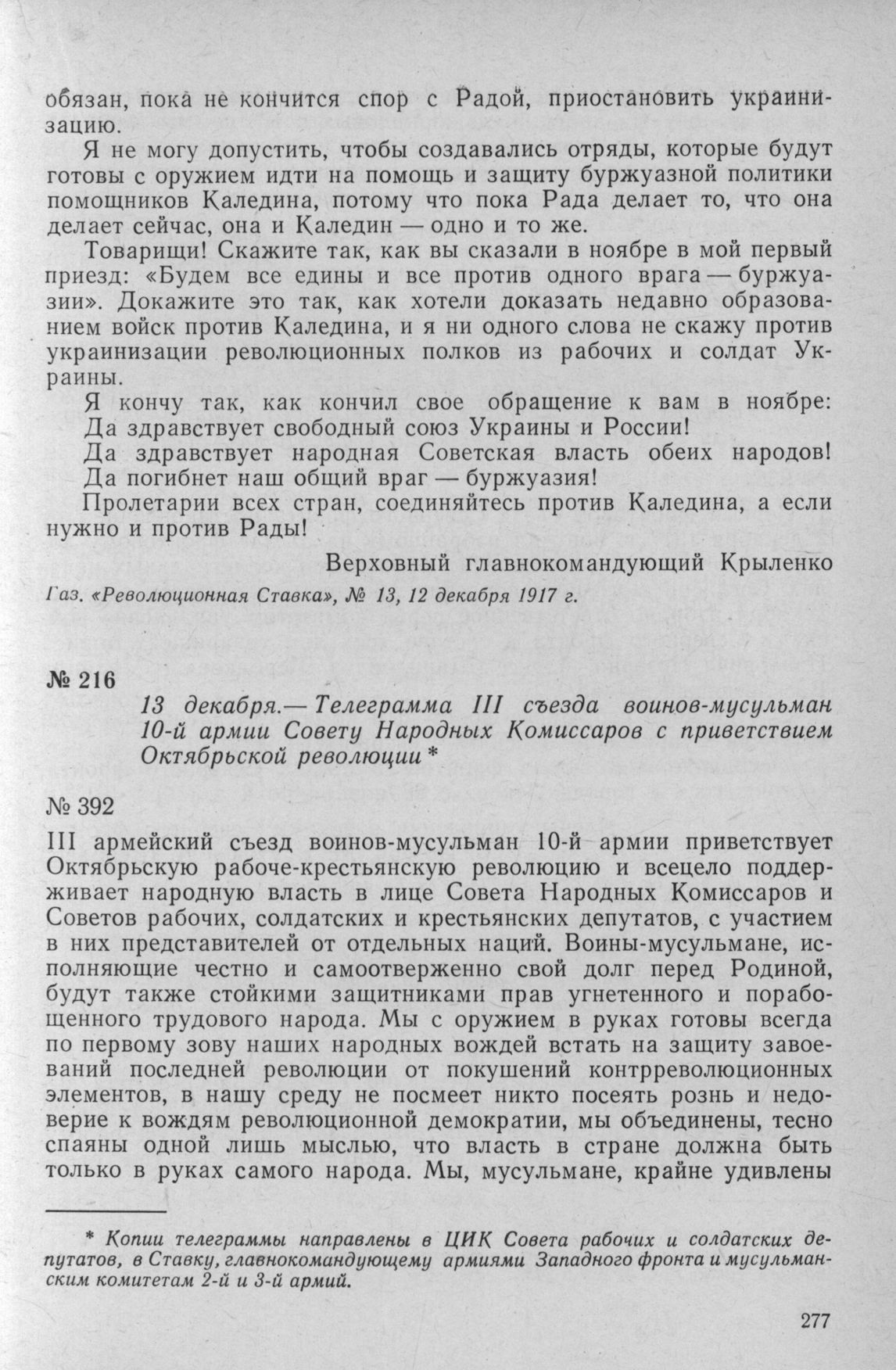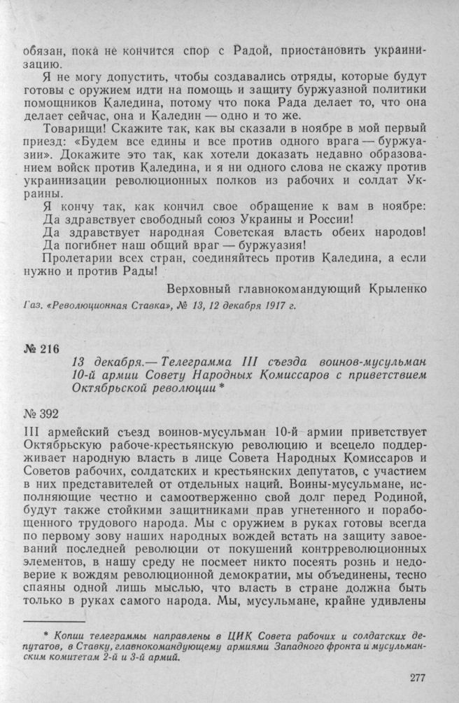 Телеграмма III съезда воинов-мусульман 10-й армии Совету Народных Комиссаров с приветствием Октябрьской революции. 13 декабря 1917 г.