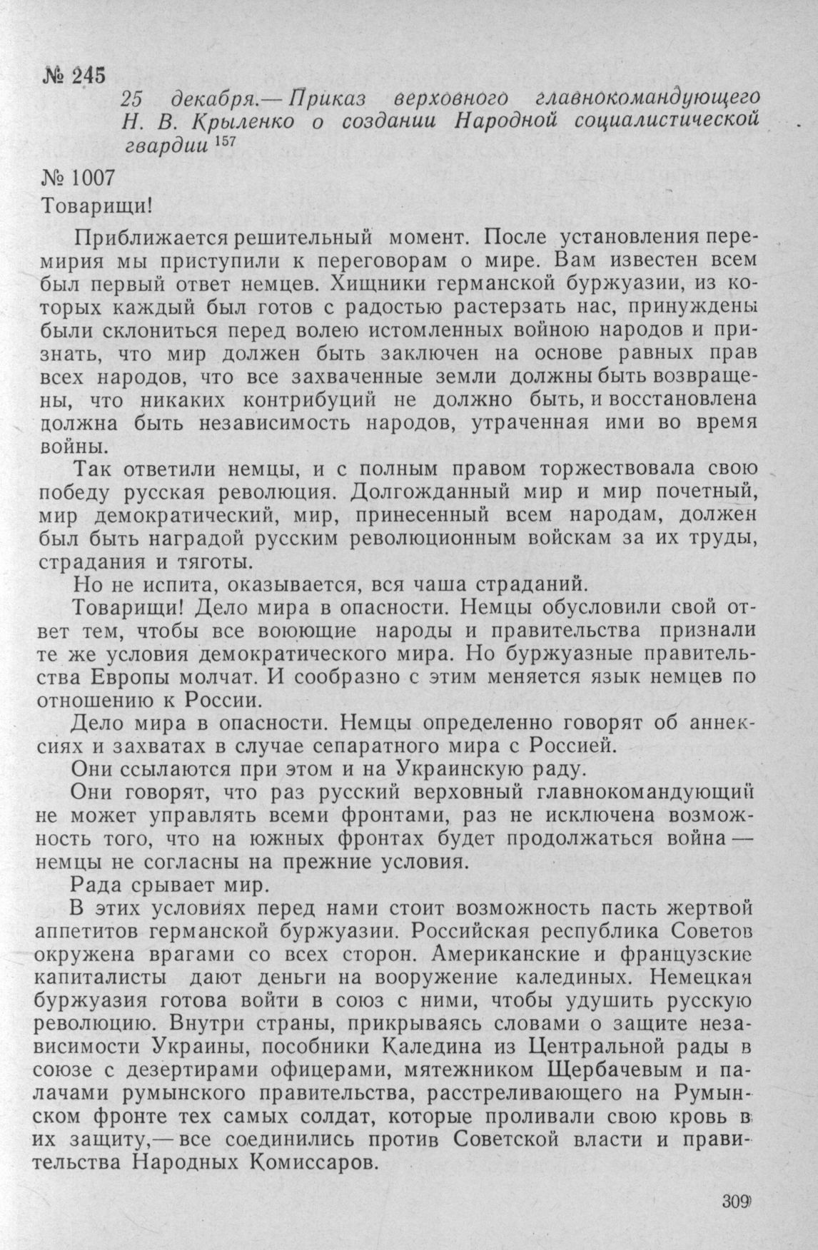 Приказ верховного главнокомандующего Н. В. Крыленко о создании Народной социалистической гвардии. 25 декабря 1917 г.