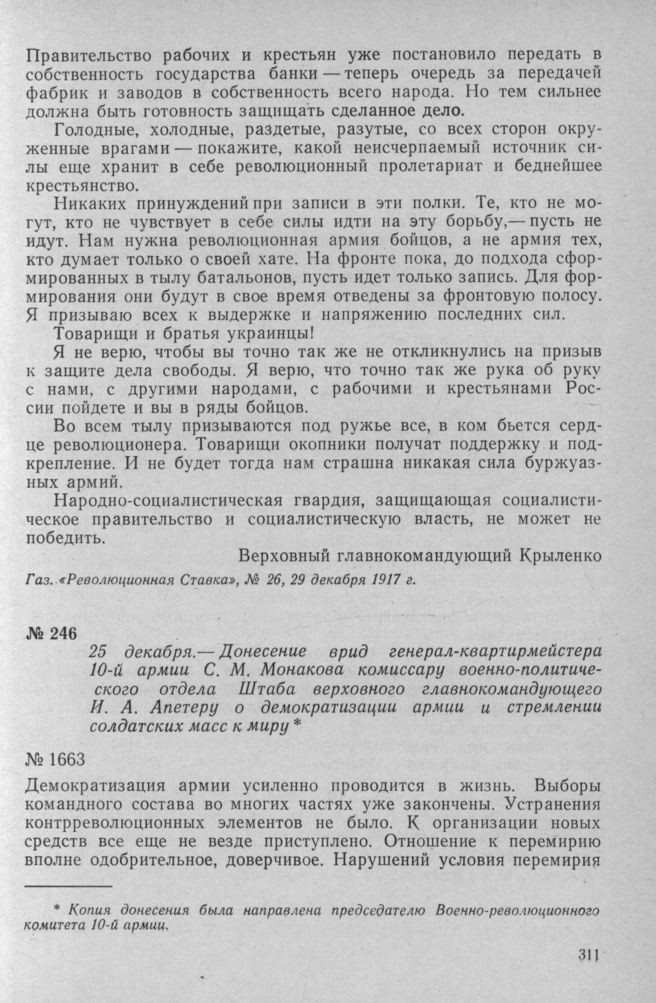 Донесение врид генерал-квартирмейстера 10-й армии С. М. Монакова комиссару военно-политического отдела Штаба верховного главнокомандующего И. А. Апетеру о демократизации армии и стремлении солдатских масс к миру. 25 декабря 1917 г. // ЦГВИА, Ф. 2003, Оп. 4, Д. 51, Л. 149. Телегр. лента.