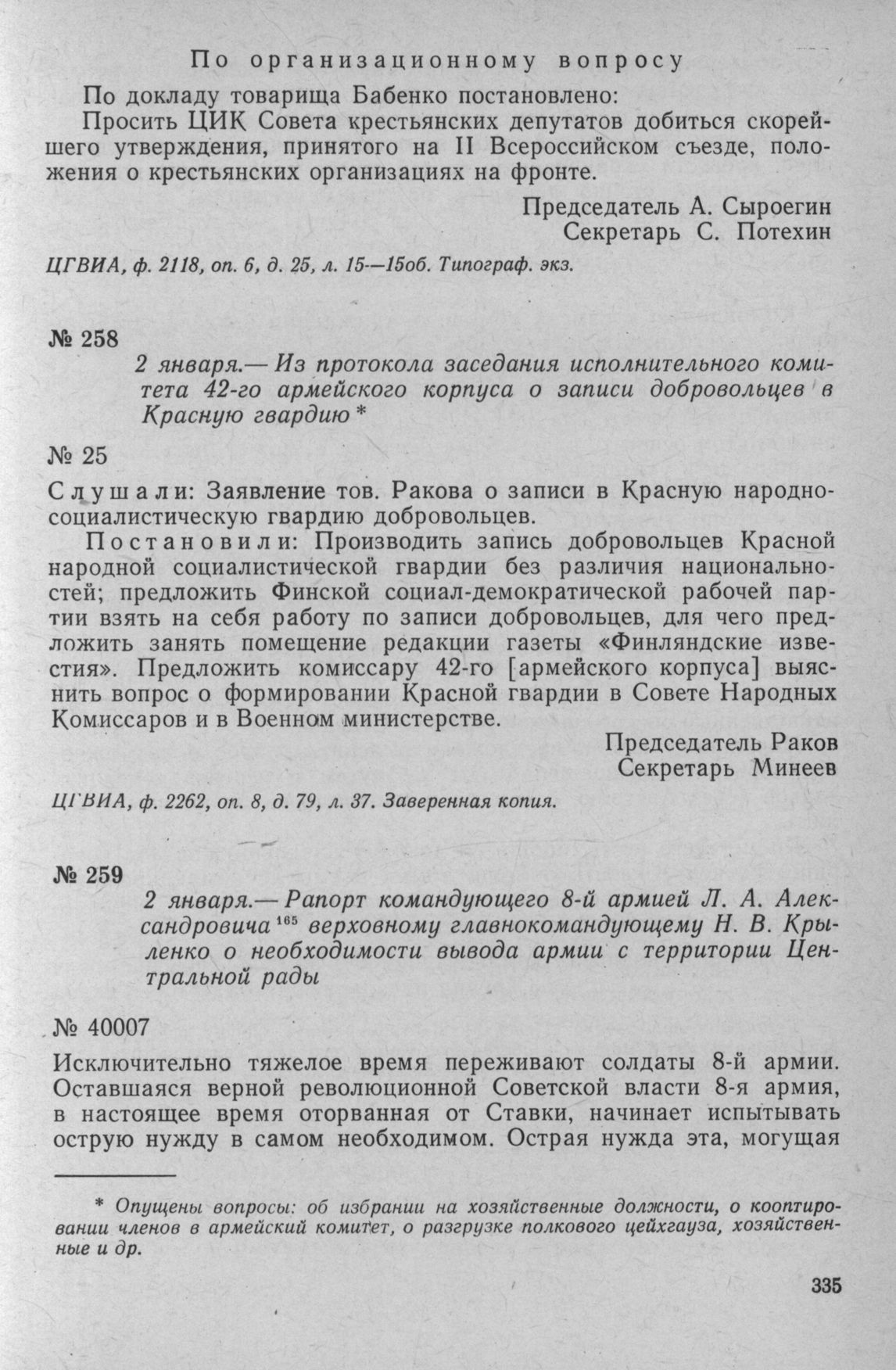 Рапорт командующего 8-й армией Л. А. Александровича верховному главнокомандующему Н. В. Крыленко о необходимости вывода армии с территории Центральной рады. 2 января 1918 г. // ЦГВИА, Ф. 2003, Оп. 1, Д. 537, Л. 81—81об. Заверенная копия.