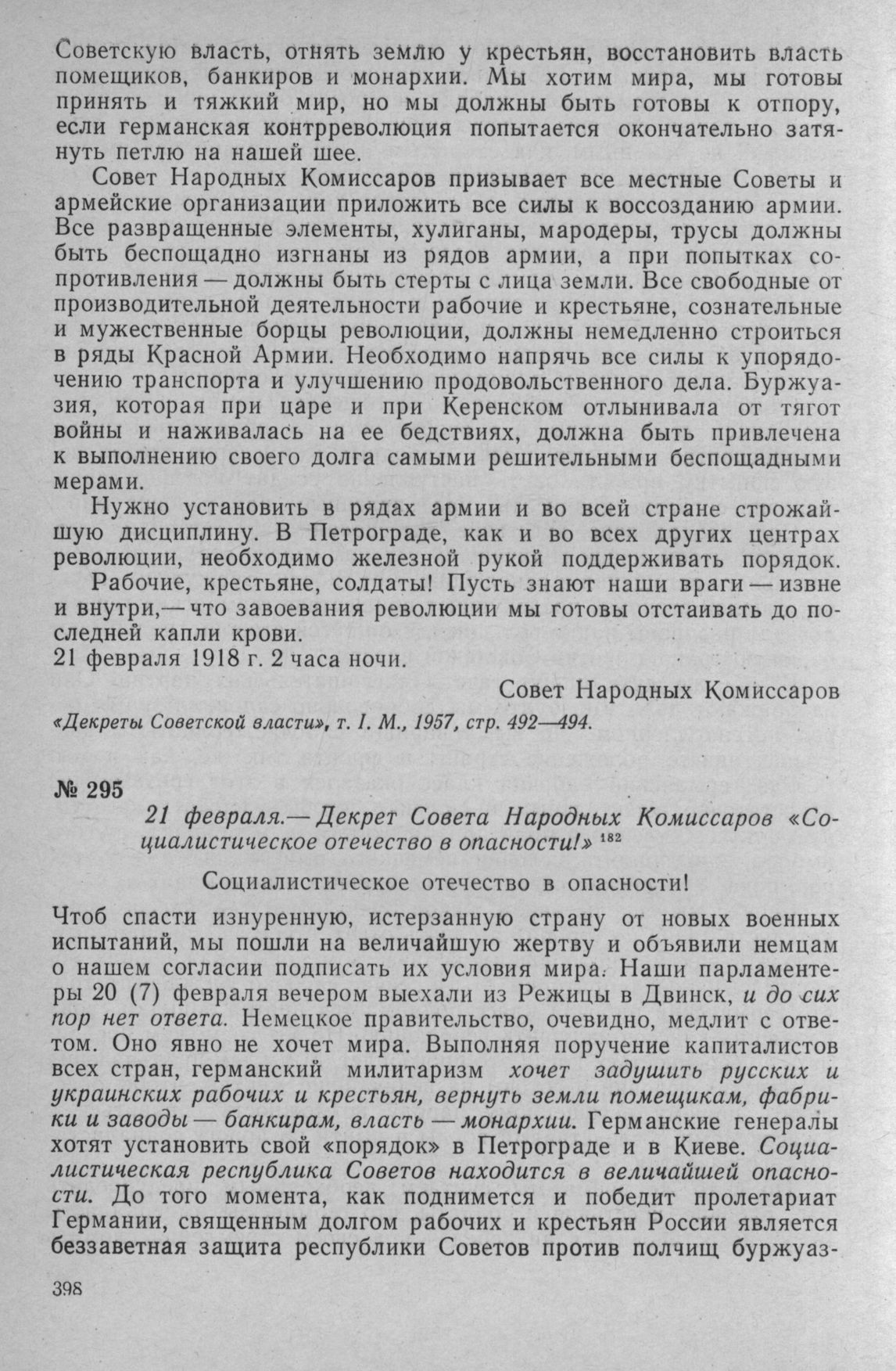 Декрет Совета Народных Комиссаров «Социалистическое отечество в опасности!». 21 февраля 1918 г. // В. И. Ленин. Полн. собр. соч., Т. 35, стр. 357—358.