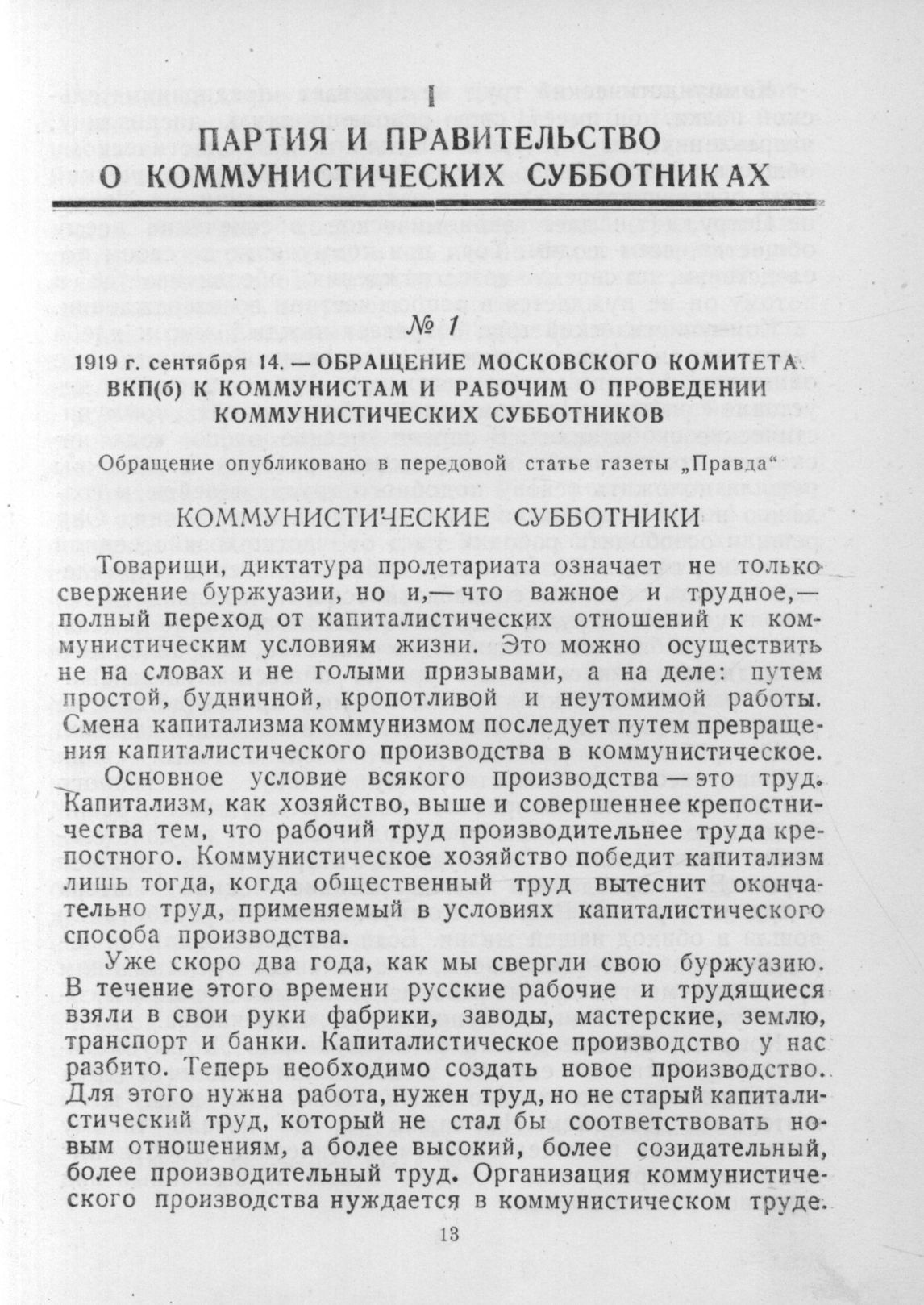 Обращение Московского Комитета ВКП(б) к коммунистам и рабочим о проведении коммунистических субботников. 14 сентября 1919 г. // «Правда», 14 сентября 1920 г. № 204.