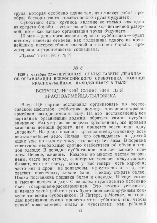 Передовая статья газеты «Правда» об организации Всероссийского субботника помощи красноармейцам, находящимся в тылу. 22 октября 1920 г. // «Правда», 22 октября 1920 г. № 236.