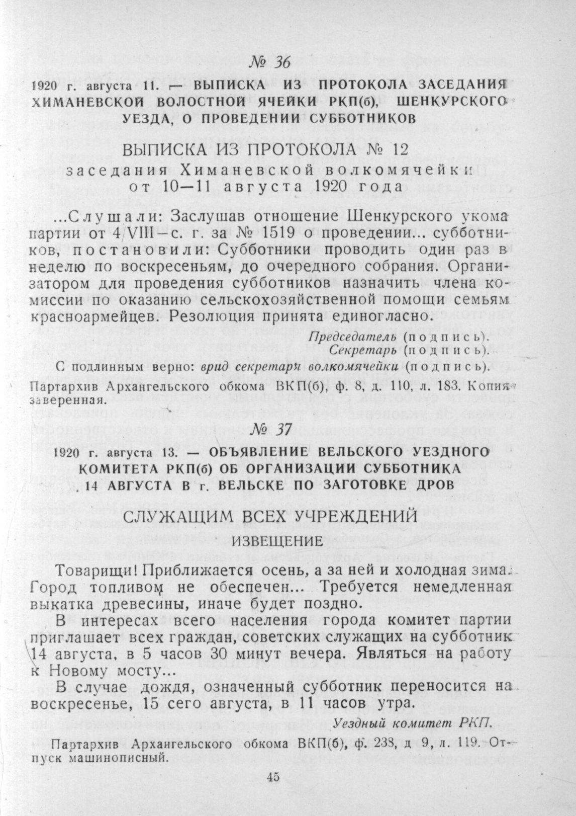 Выписка из протокола заседания Химаневской волостной ячейки РКП(б), Шенкурского уезда, о проведении субботников. 11 августа 1920 г. // Партархив Архангельского обкома ВКП(б), Ф. 8, Д. 110, Л. 183. Копия заверенная.