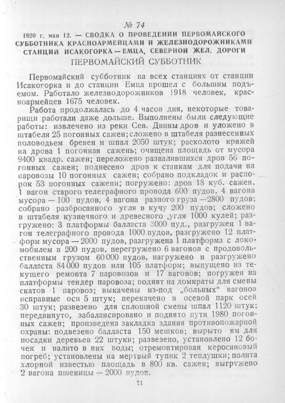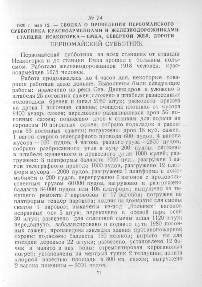 Сводка о проведении первомайского субботника красноармейцами и железнодорожниками станций Исакогорка-Емца, Северной жел. дороги. 12 мая 1920 г. // Газета «Известия Архгубревкома и губкома РКП(б)», 12 мая 1920 г. № 62.