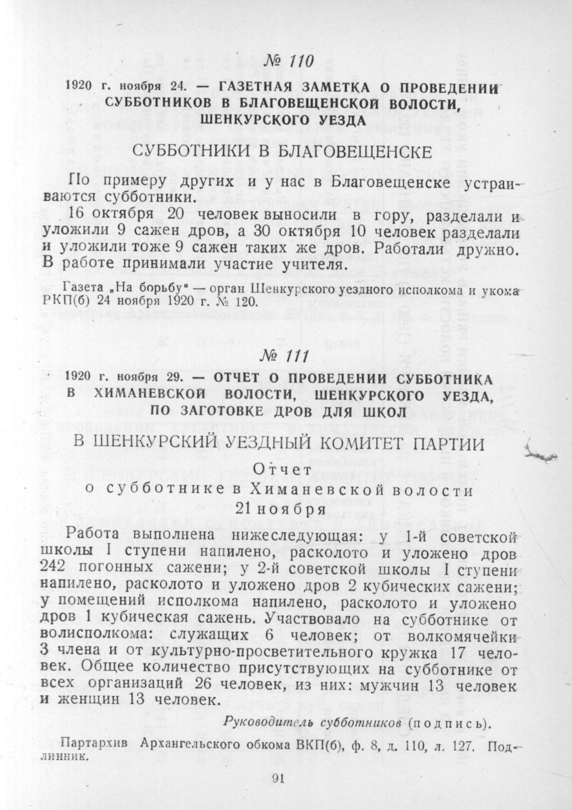 Газетная заметка о проведении субботников в Благовещенской волости, Шенкурского уезда. 24 ноября 1920 г. // Газета «На борьбу»—орган Шенкурского уездного исполкома и укока РКП(б) 24 ноября 1920 г. № 120.