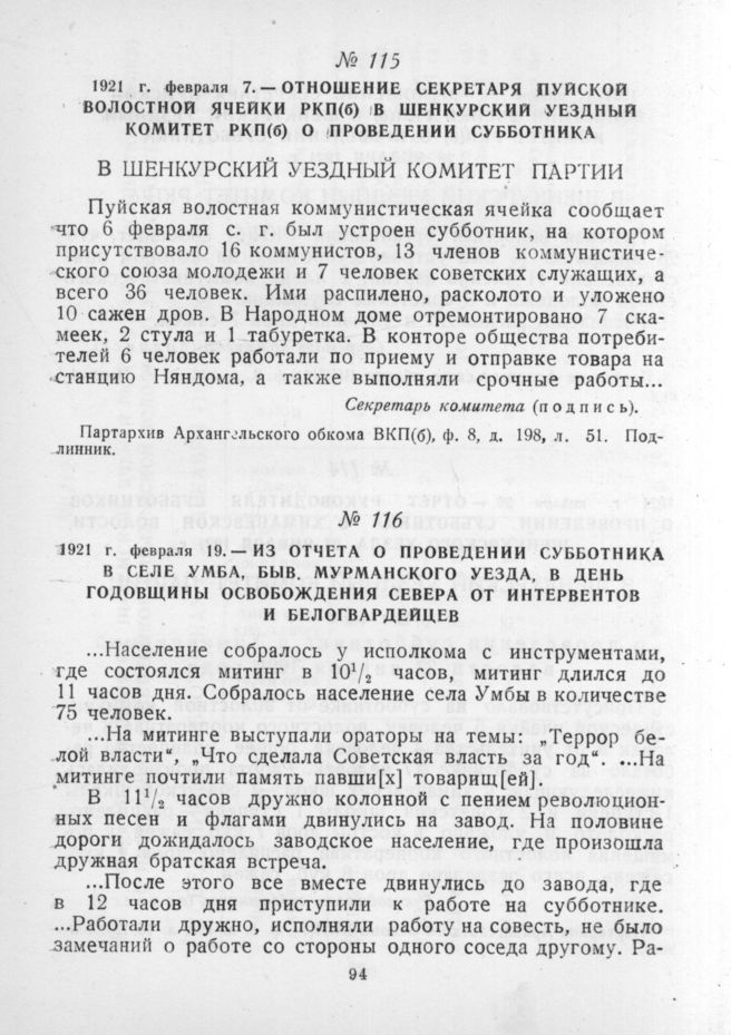 Из отчета о проведении субботника в селе Умба, быв. Мурманского уезда, в день годовщины освобождения севера от интервентов и белогвардейцев. 19 февраля 1921 г. // Партархив Архангельского обкома ВКП(б), Ф. 1, Д. 546, Л. 5. Копия заверенная.
